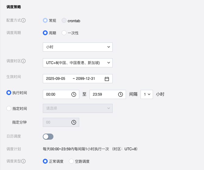 支持常规、crontab 配置方式。单个任务配置默认选择常规,且不可修改。