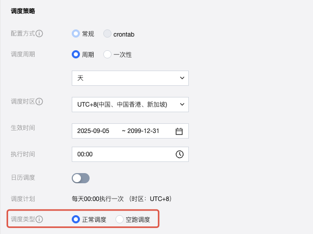 支持选择正常调度和空跑调度。空跑调度是指调度到该任务时,系统会直接将实例置成功,不会真正执行任务。正常调度即正常执行任务代码。