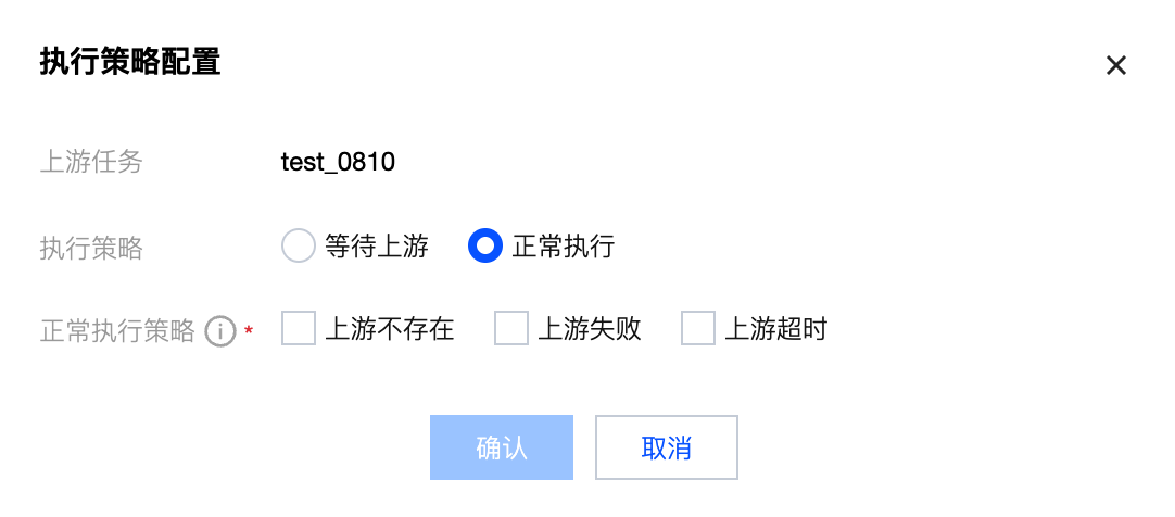 执行策略:依赖的上游任务实例不存在时处理策略,默认为等待上游;选择等待上游表示上游任务实例不存在时持续等待,选择正常执行可选在上游任务实例不存在、上游任务失败、上游超时三种状态下正常执行。