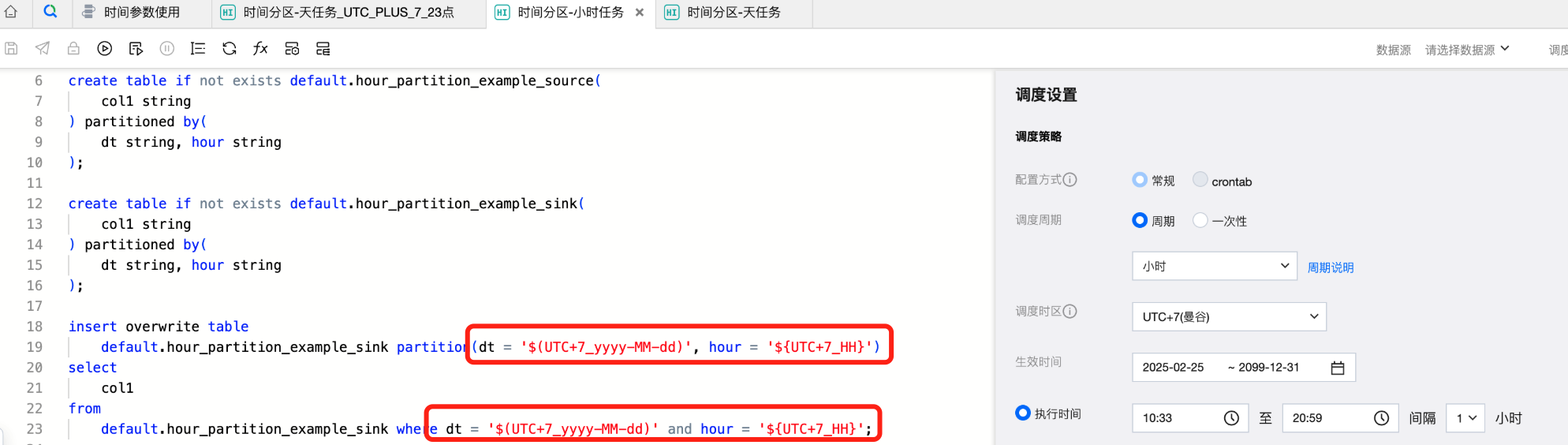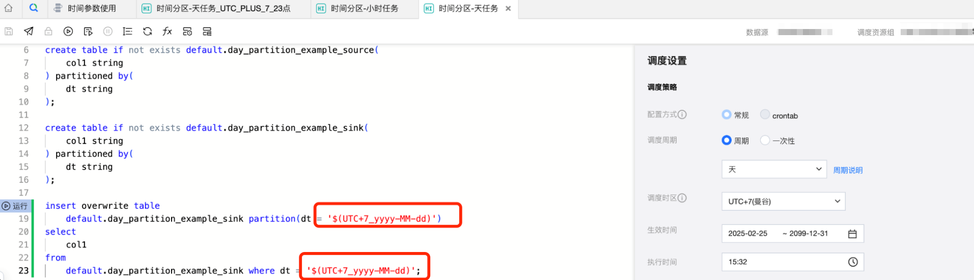 create table if not exists default.day_partition_example_source(col1 string) partitioned by(dt string);create table if not exists default.day_partition_example_sink(col1 string) partitioned by(dt string);insert overwrite tabledefault.day_partition_example_sink partition(dt = '$(UTC+7_yyyy-MM-dd)')selectcol1fromdefault.day_partition_example_sink where dt = '$(UTC+7_yyyy-MM-dd)';