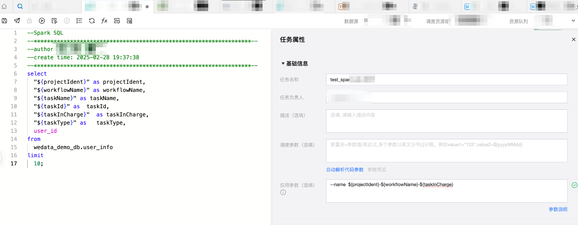 select "${projectIdent}" as projectIdent, "${workflowName}" as workflowName, "${taskName}" as taskName, "${taskId}" as taskId, "${taskInCharge}" as taskInCharge, "${taskType}" as taskType, user_id from wedata_demo_db.user_info limit 10;