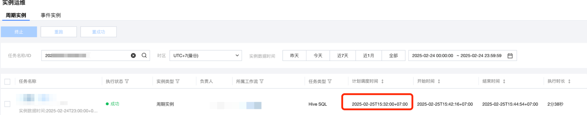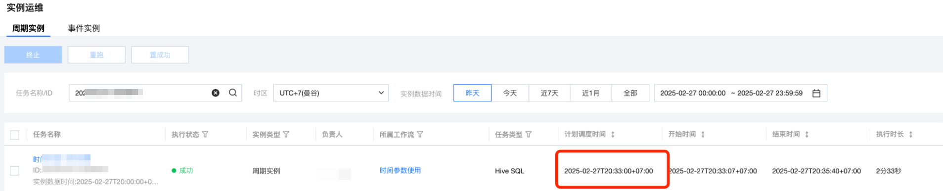 计划调度时间(UTC+±n 时区) | $(UTC±n_时间参数) 是表示基于UTC±n 时区的计划调度时间。时间参数同实例数据时间,可以任意组合参数,例如 $(UTC+7_yyyyMMdd)、$(UTC+9_yyyy-MM-dd)、$(UTC-1_HH:mm:ss) 和$(UTC+0_yyyyMMddHHmmss)等 | 指实例计划调度时间,也是实例生成时间,精确到秒。计划调度时间可通过$(UTC±n_yyyyMMddHHmmss) 获取,表示 UTC±n 时区下的计划调度时间。 具体是指在调度配置中定义的执行时间。 ![]() |