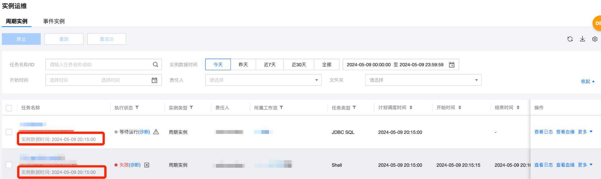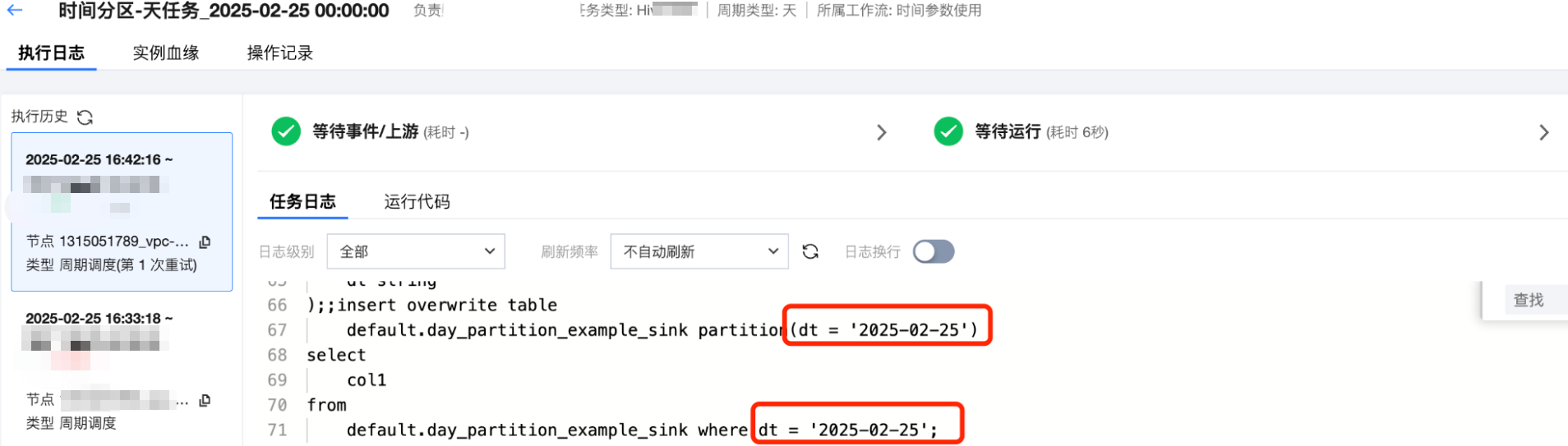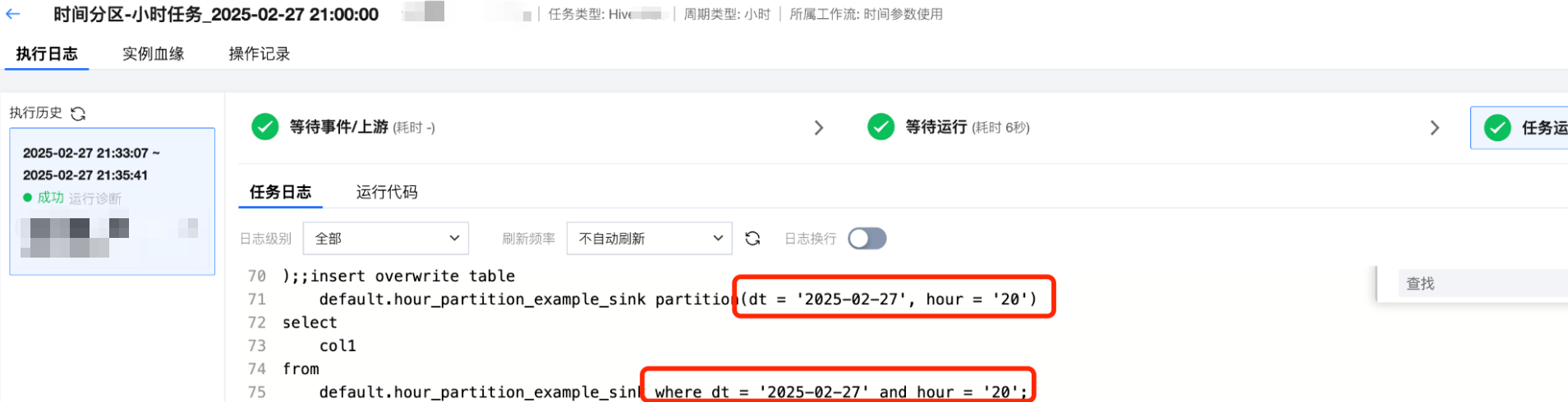 实例执行时间 (UTC+8 时区) | $[时间参数]是表示基于 UTC+8 时区的实例执行时间。时间参数同上,可以任意组合参数,例如$[yyyyMMdd]、$[yyyy-MM-dd]、$[HH:mm:ss]和$[yyyyMMddHHmmss]等 | 指实例实际执行的开始时间,精确到秒。实例执行时间可通过 $[yyyyMMddHHmmss] 获取,表示 UTC+8 时区下的实例执行时间。 |