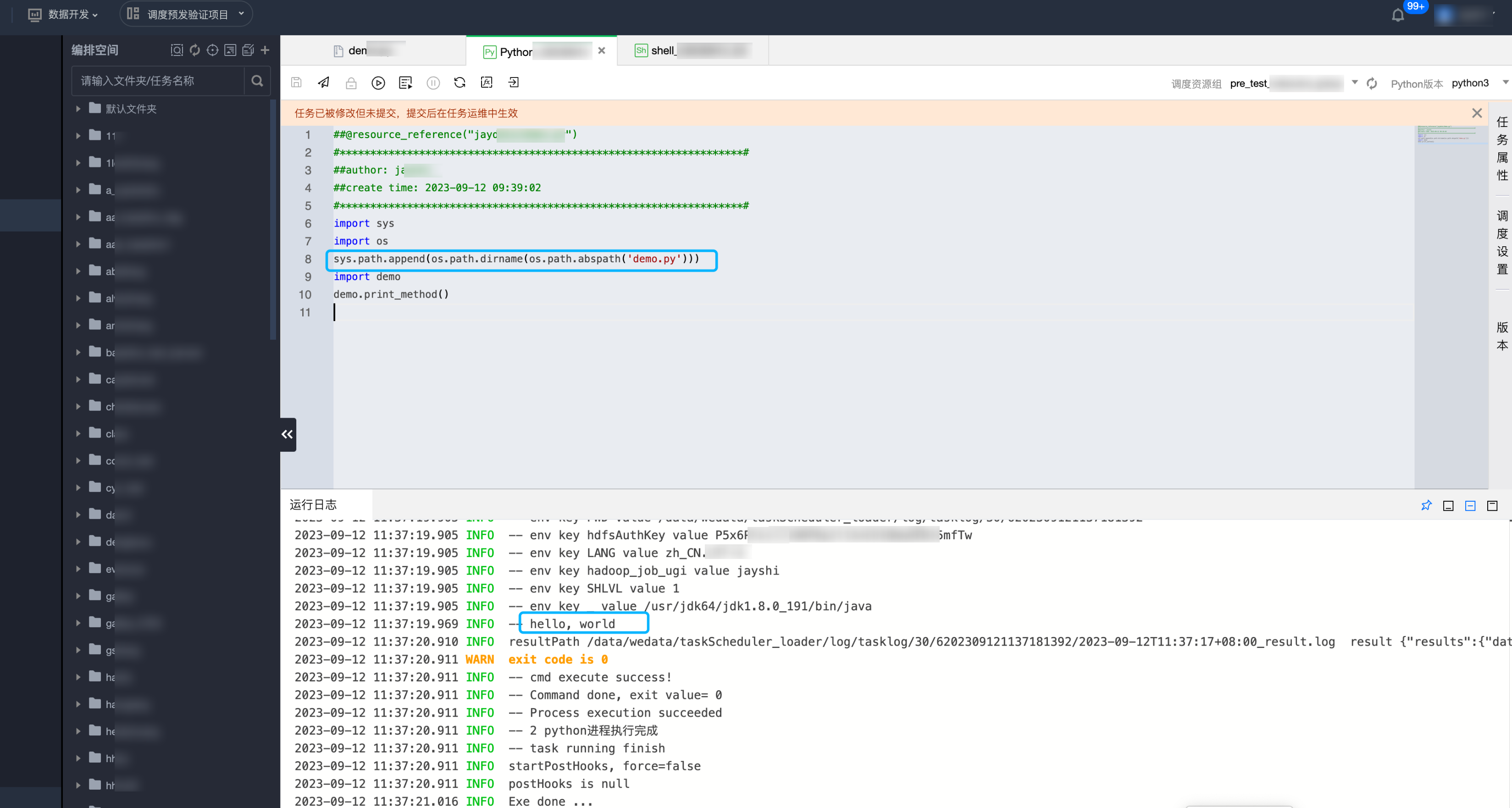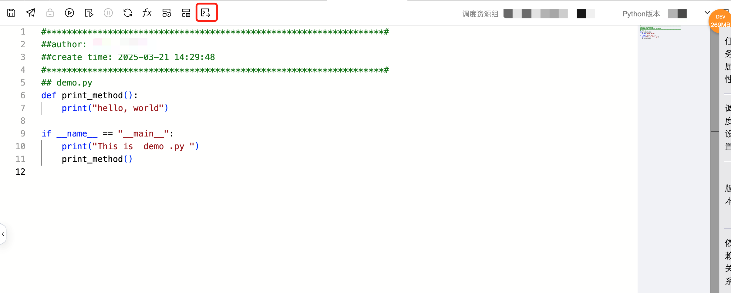 1.在离线开发 > 编排空间 > Python 任务界面,在 Python 任务中编辑所需的资源内容,单击编辑器上方操作栏的导出为资源。