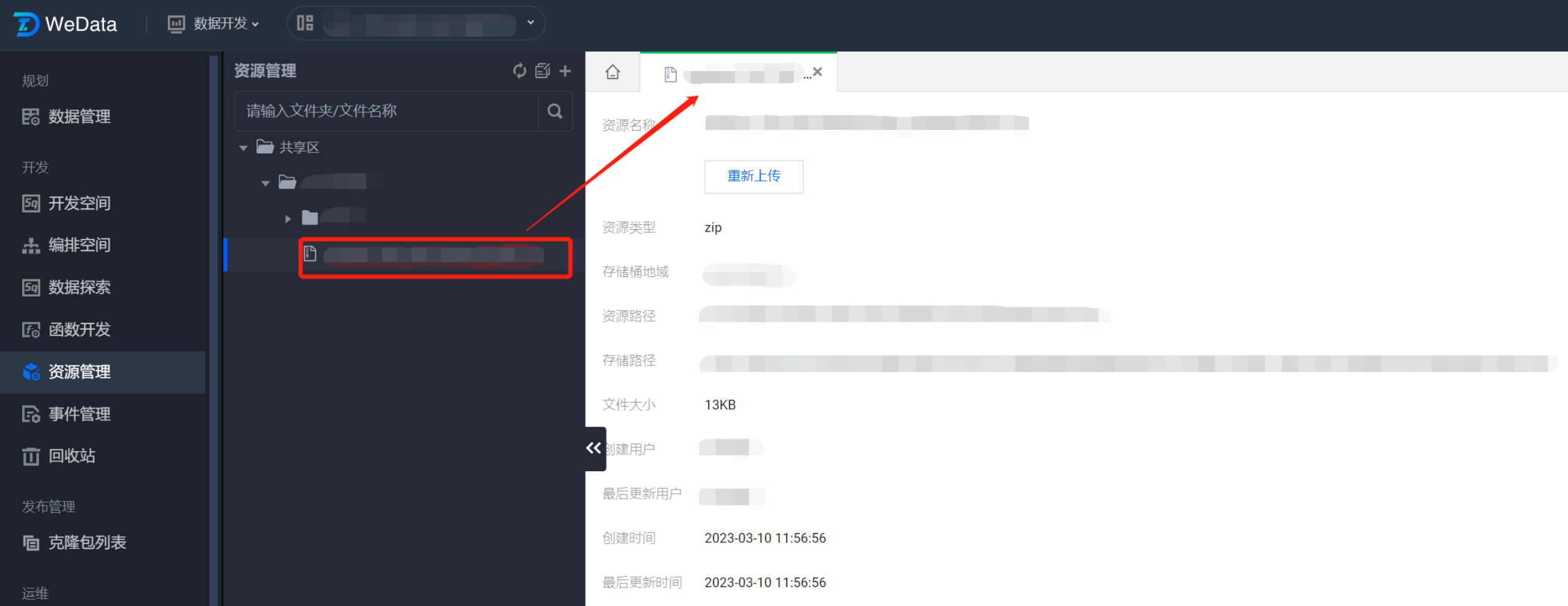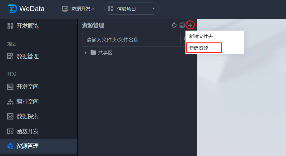 5. 在资源管理目录中,单击展开操作菜单后选择新建资源。 6. 在弹窗中上传本地的资源文件,输入资源名称,选择资源目录文件夹、存储路径后。