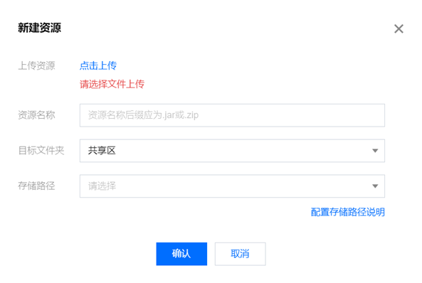 6. 新建资源:单击新建资源后,用户需要对文件名称、文件地址进行配置,在选择上传的文件后单击确认,即可完成资源上传。