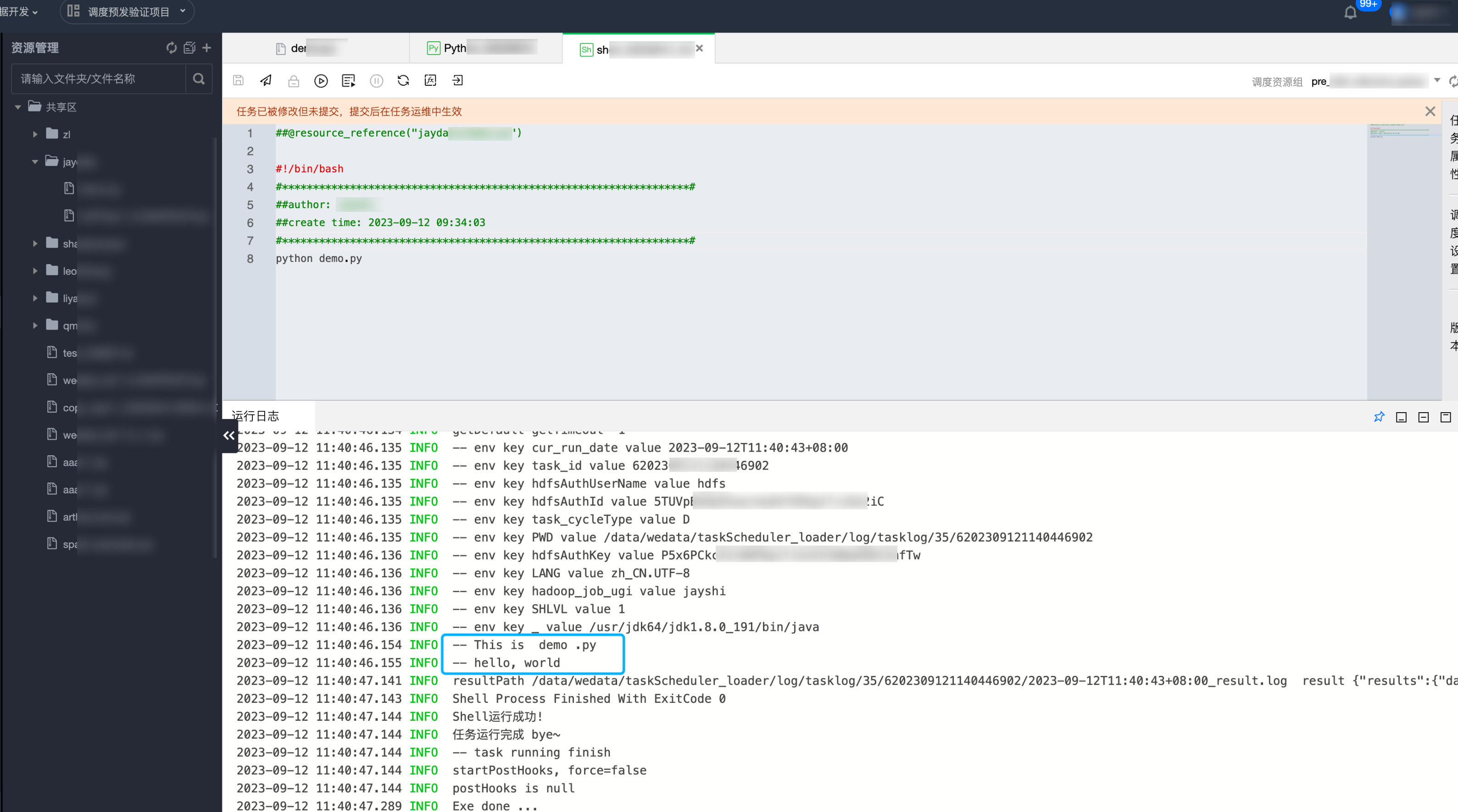 资源内容为点击导出为资源时 Python 任务代码编辑器中的内容,而非保存内容或提交版本内容。
