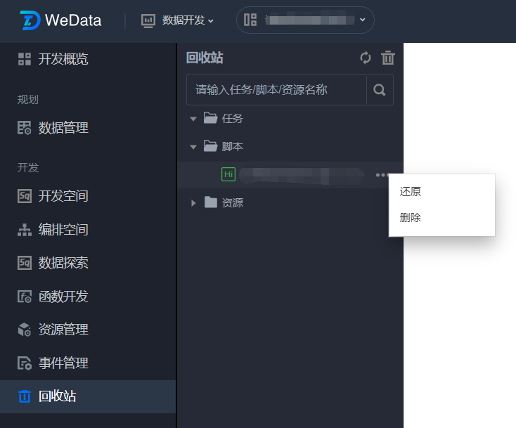 回收站支持回收开发空间、编排空间、资源管理中删除的脚本、任务与资源,以不同的目录进行分类。