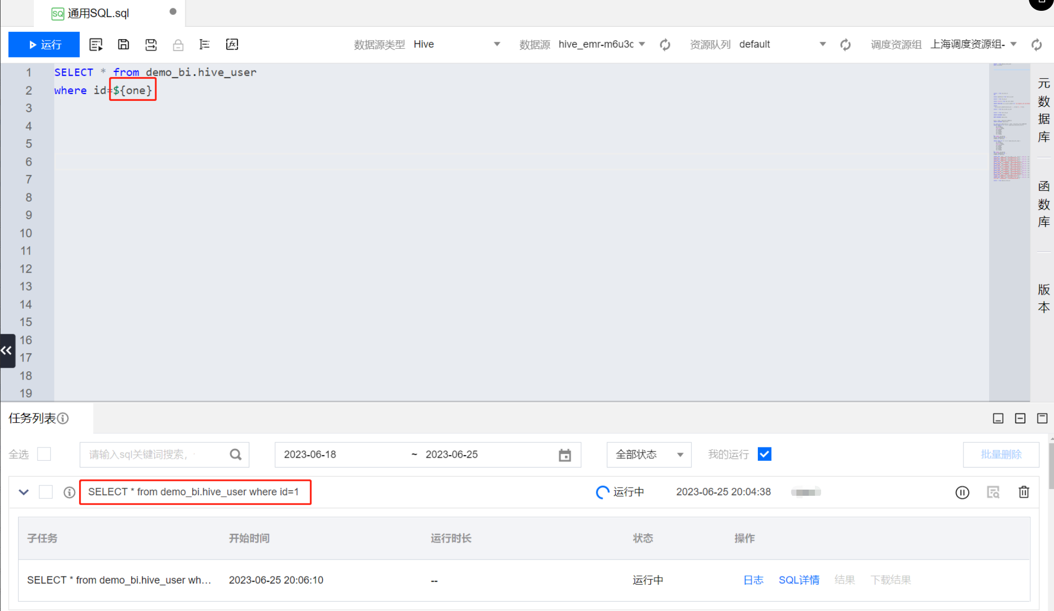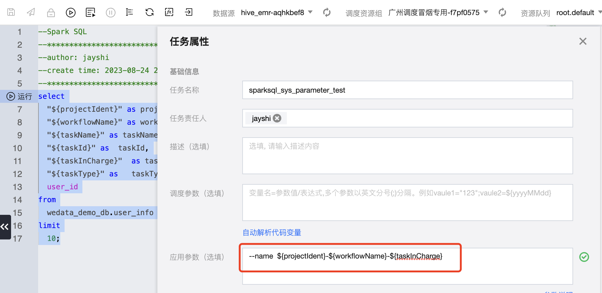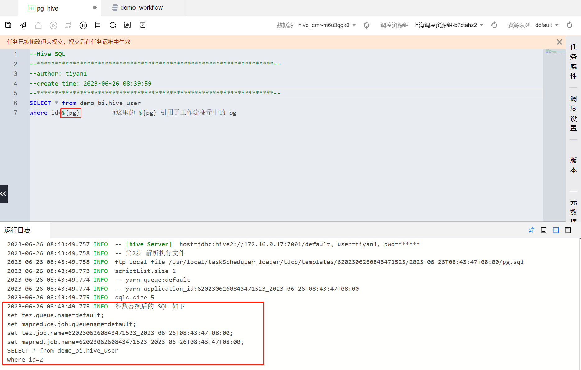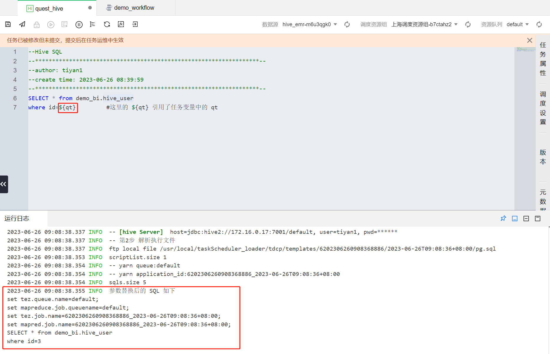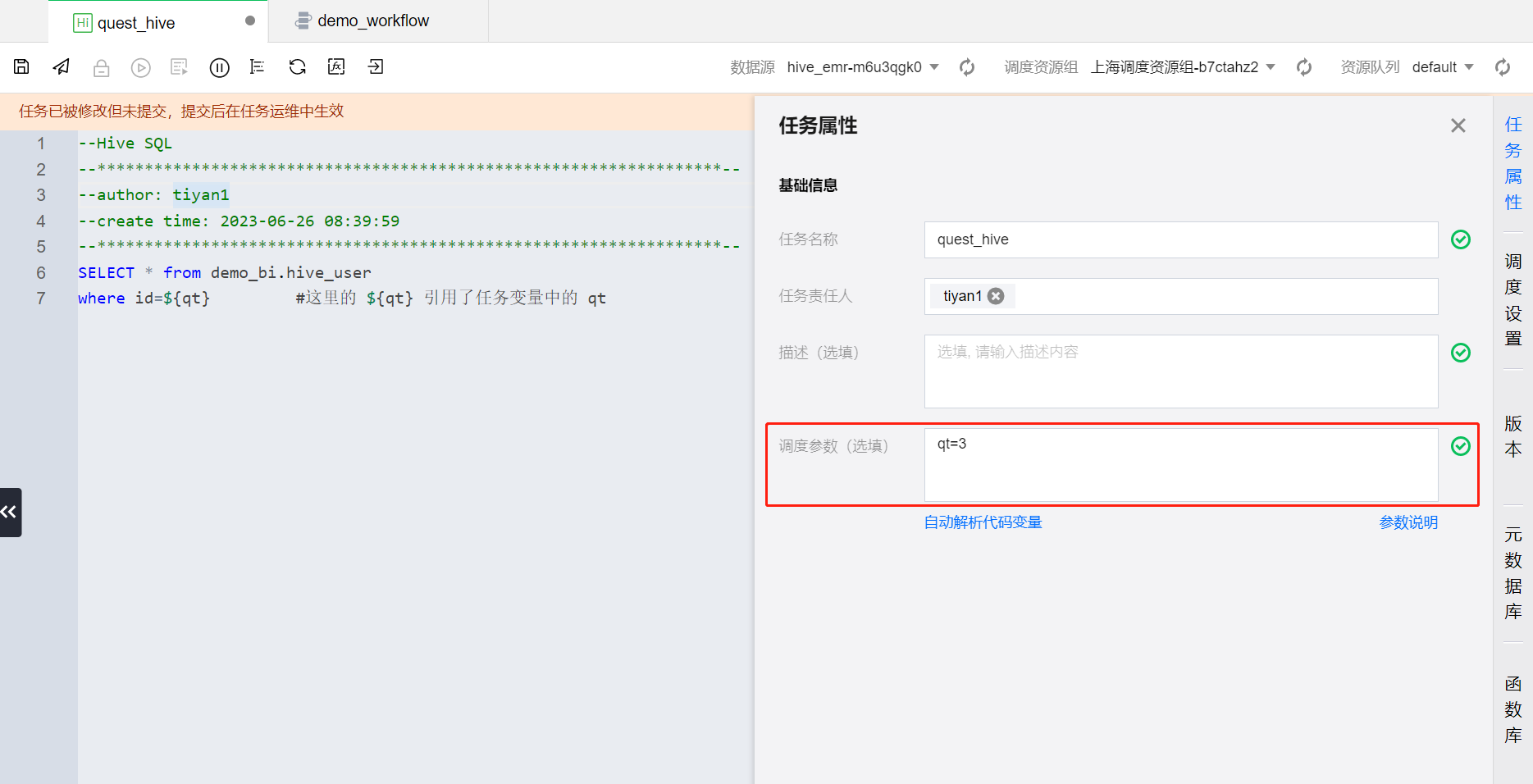 2. 再进入工作流中的 Hive SQL 计算任务,在代码中引用工作流参数的变量名,格式为:${key}