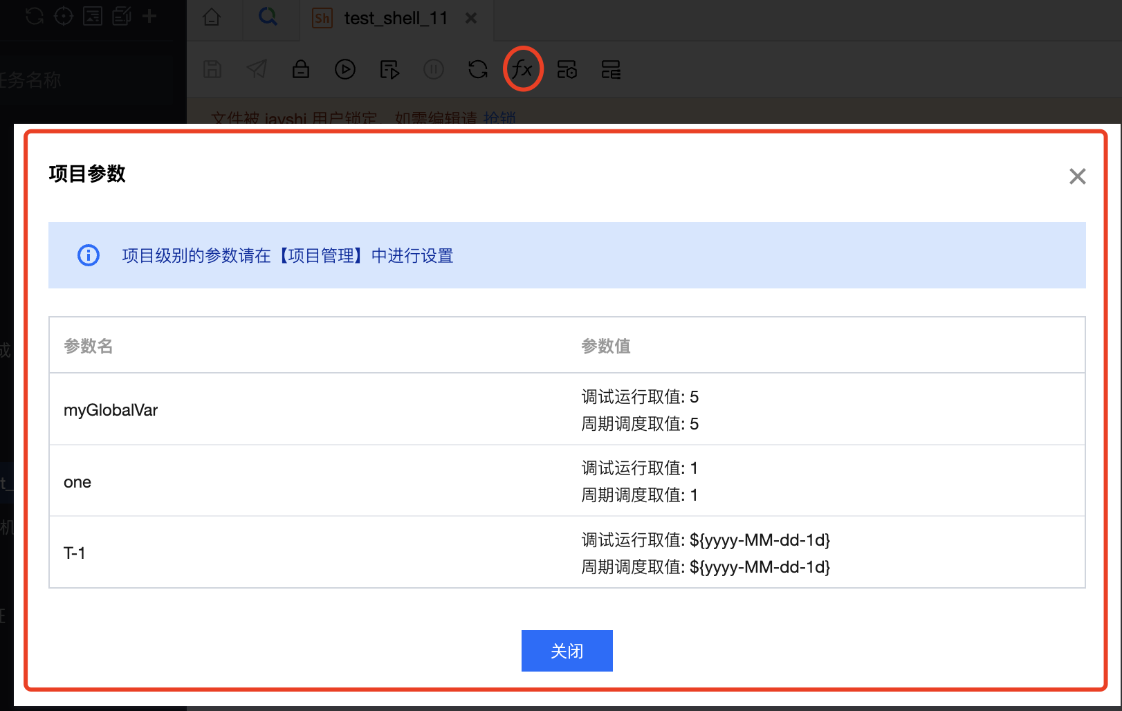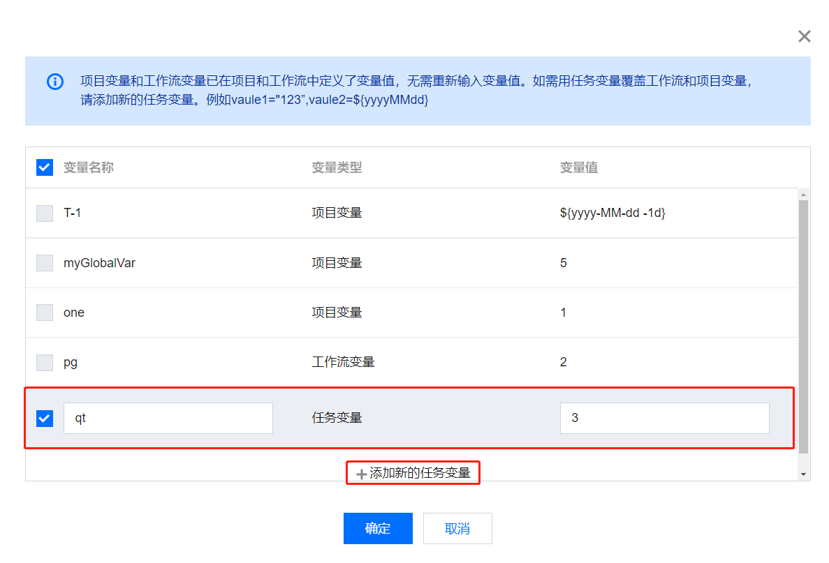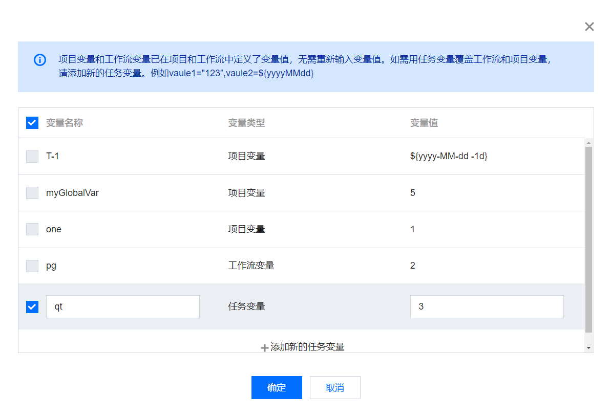 数据开发的变量使用分为三个层级,分别是项目级别、工作流级别、任务级别,不同级别的变量覆盖范围不同: