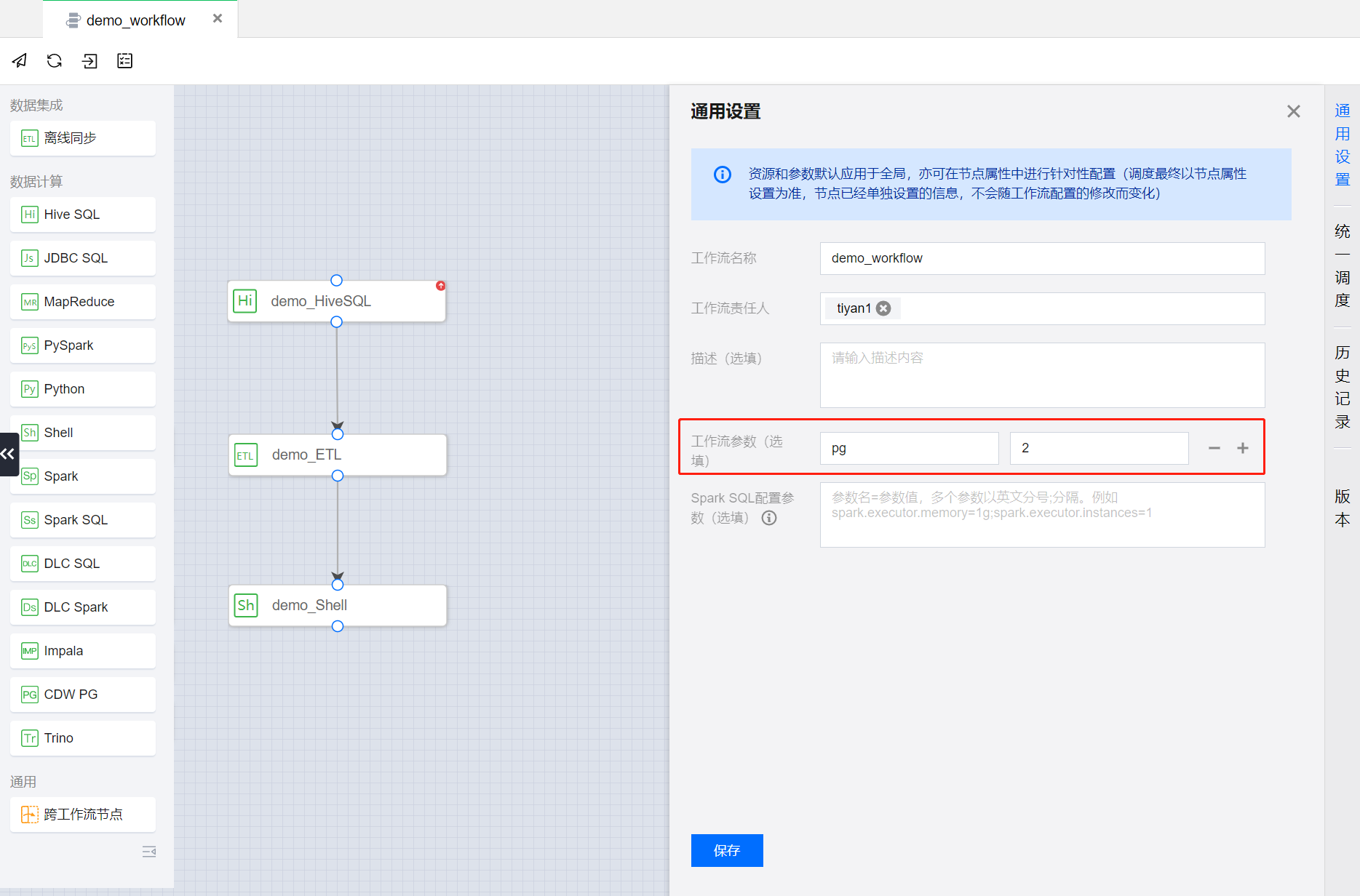 1. 在 demo_workflow 工作流的通用设置配置以下工作流参数。