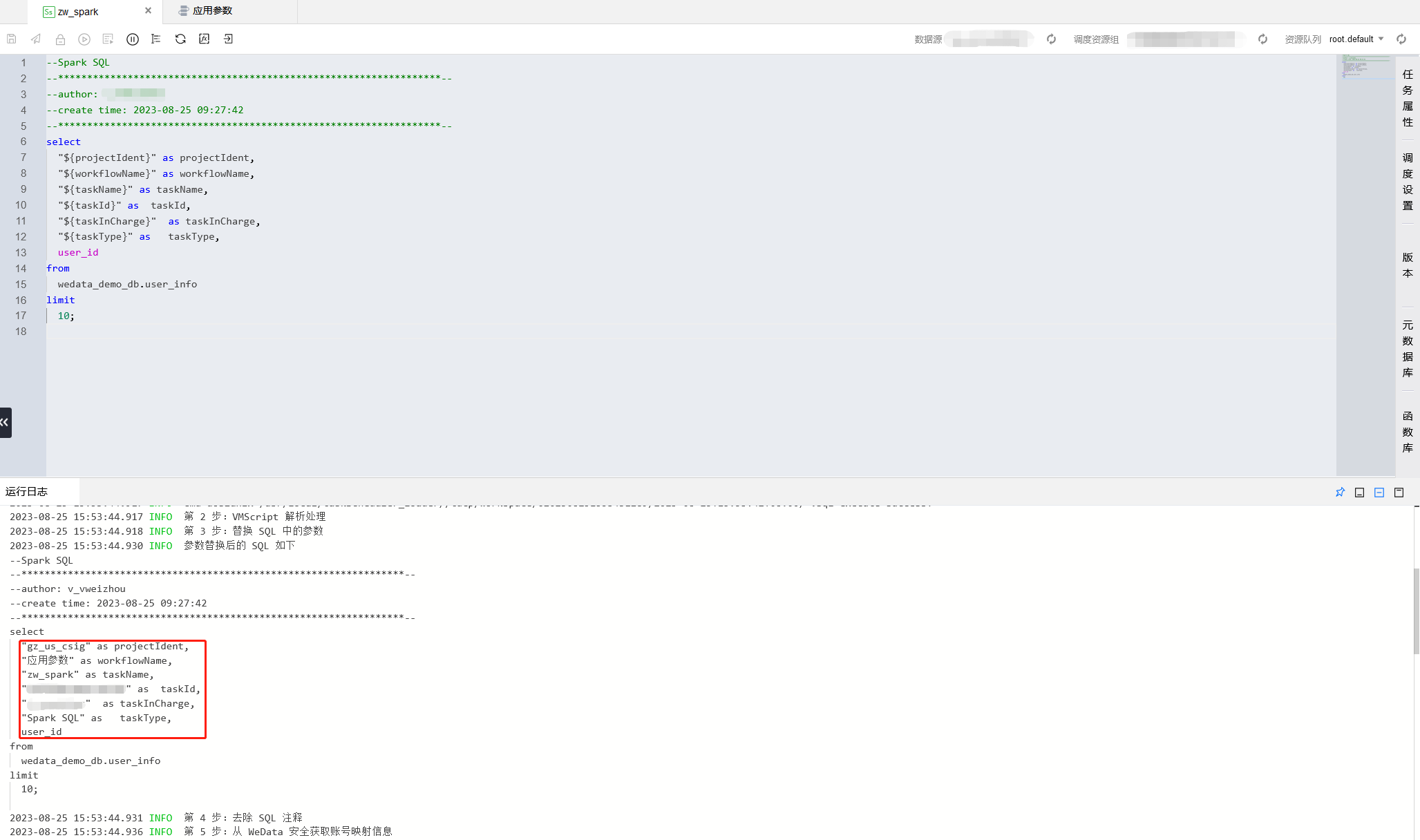 3. 从图中可以看到计算任务中引用了任务变量 qt 后,相应代码在运行时进行了参数替换。
