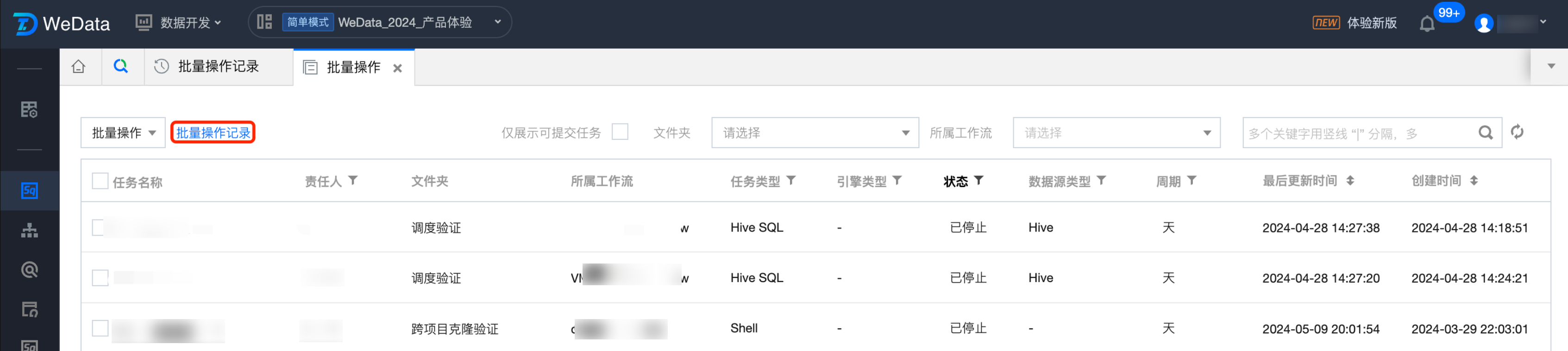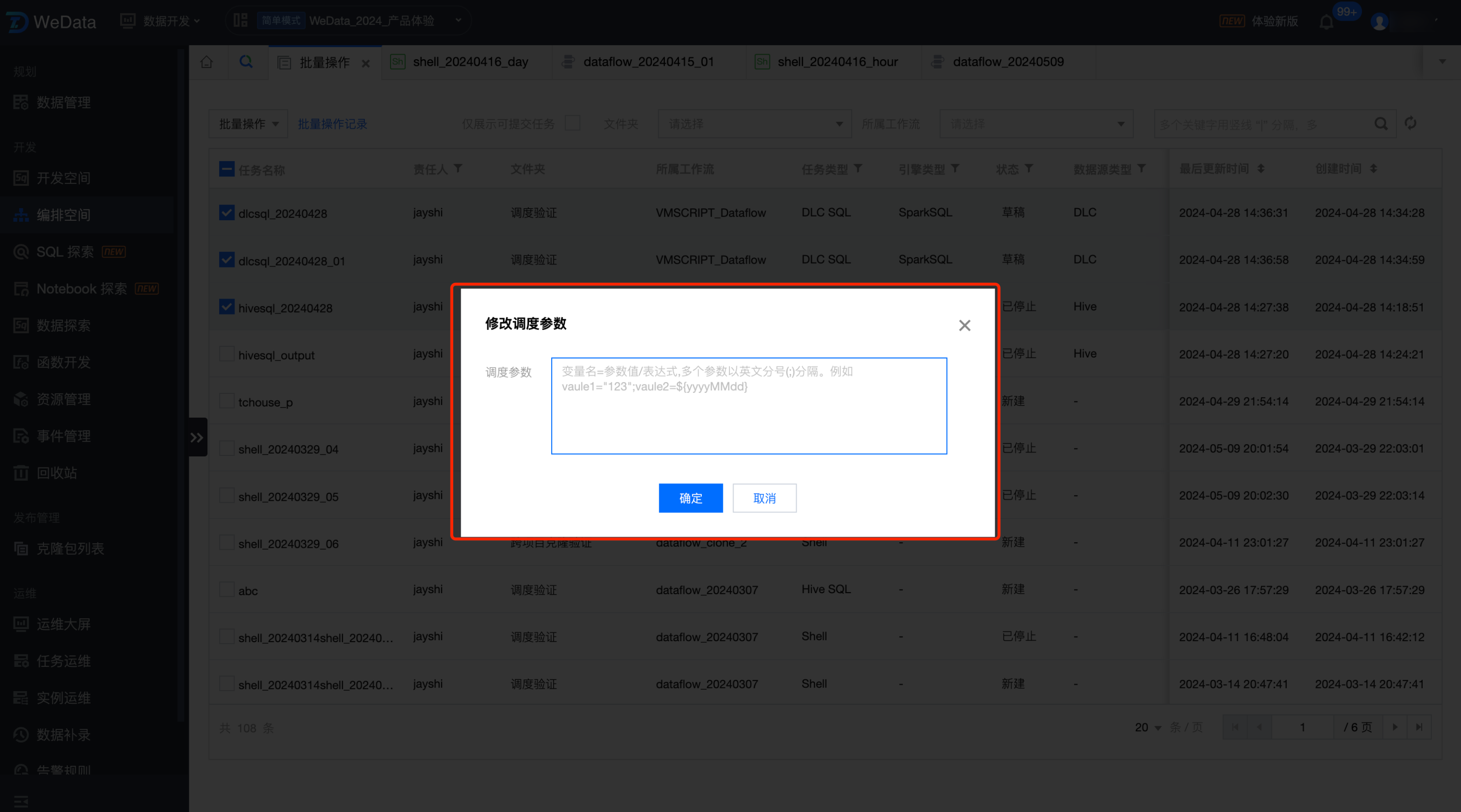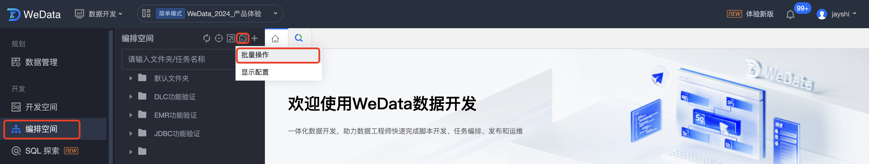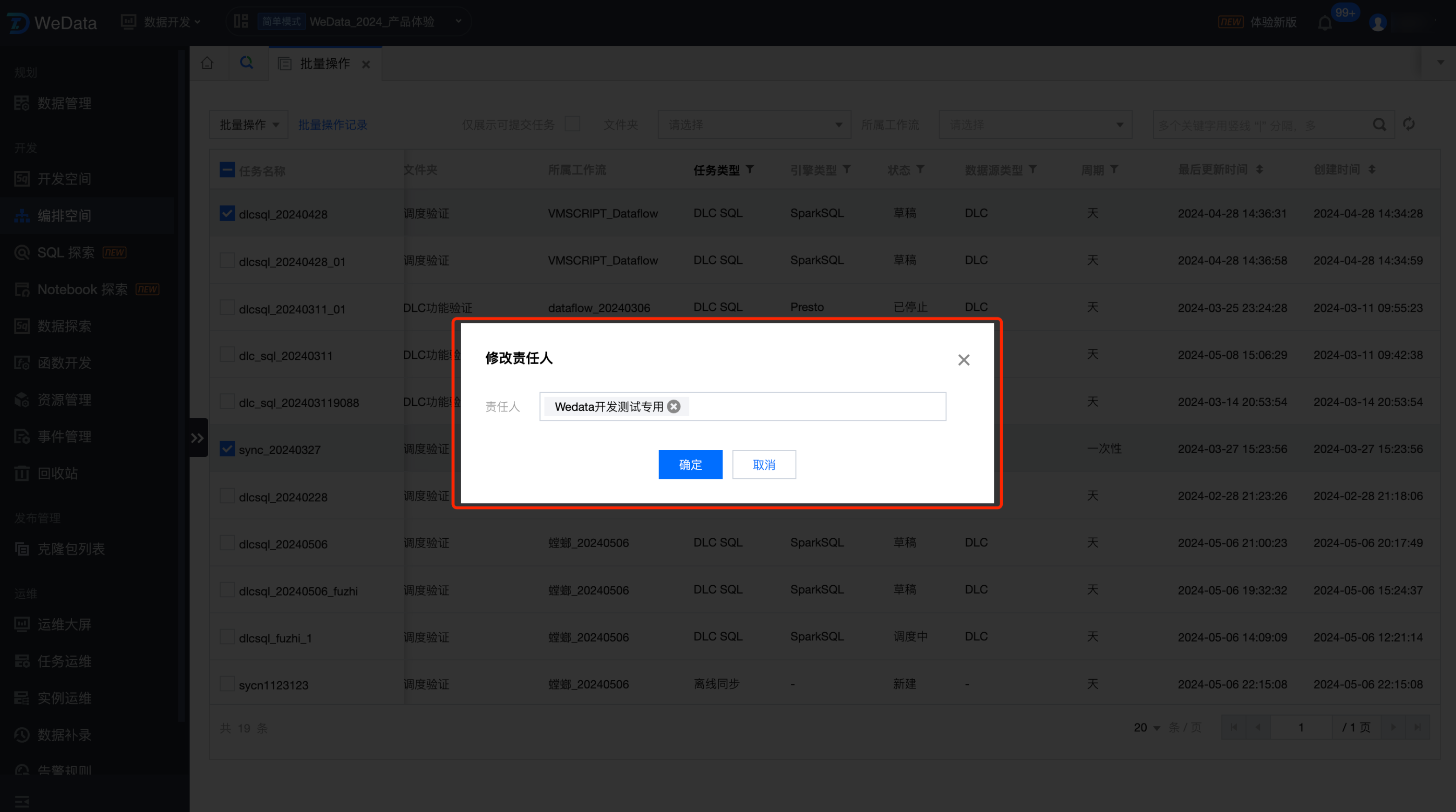登录数据开发治理平台 WeData 控制台,在 数据开发 > 编排空间左侧菜单,可以进入任务的批量操作。