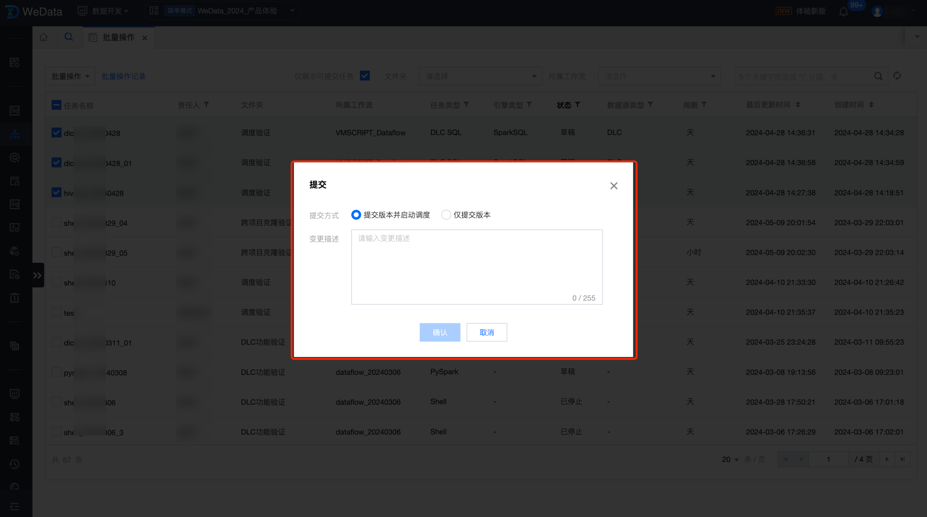 2. 选择您需要提交的任务,提交方式选择提交版本并启动调度,填写变更描述后,单击确认。