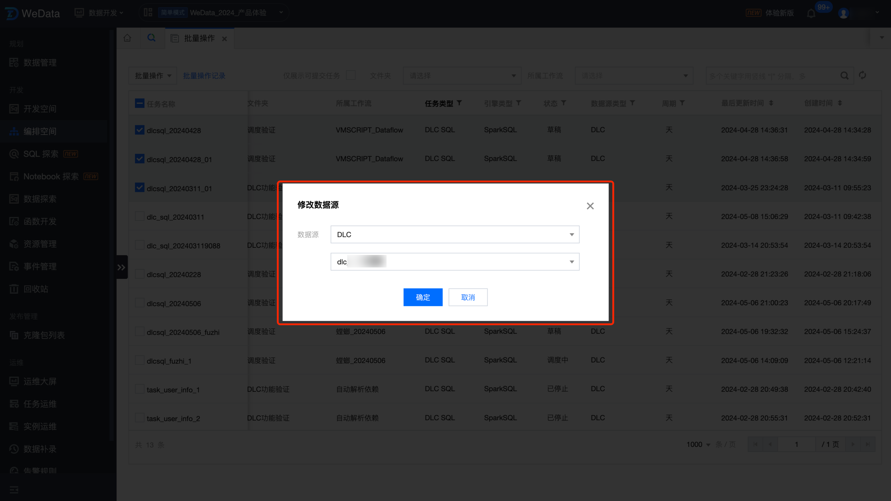 您可以批量修改选中任务的数据源。批量操作会将选中任务的数据源修改为下拉选择的数据源。