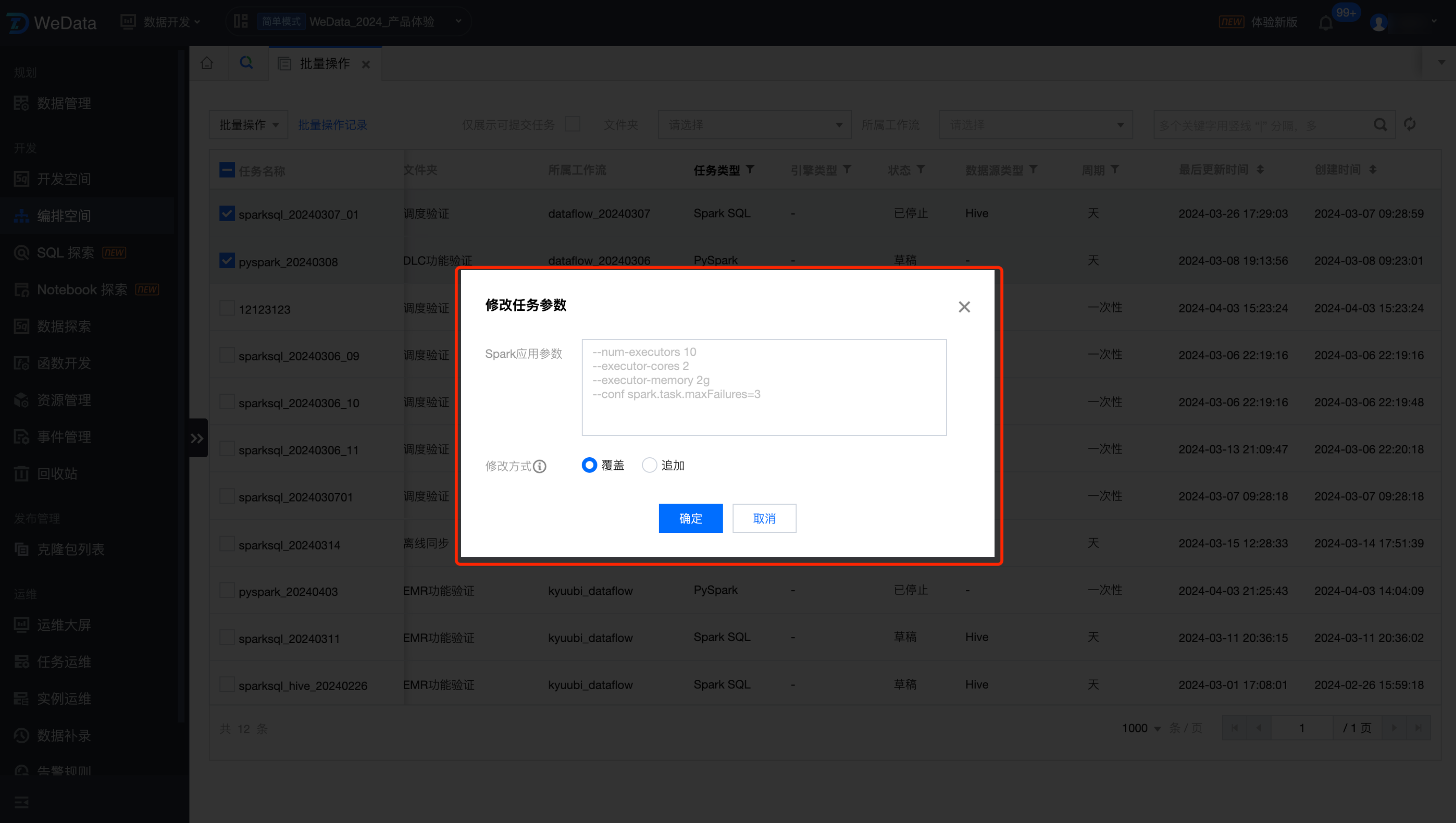 针对 EMR 引擎的 SparkSQL、PySpark、Spark 任务的参数输入内容如下。提供了两种修改方式:覆盖和追加。