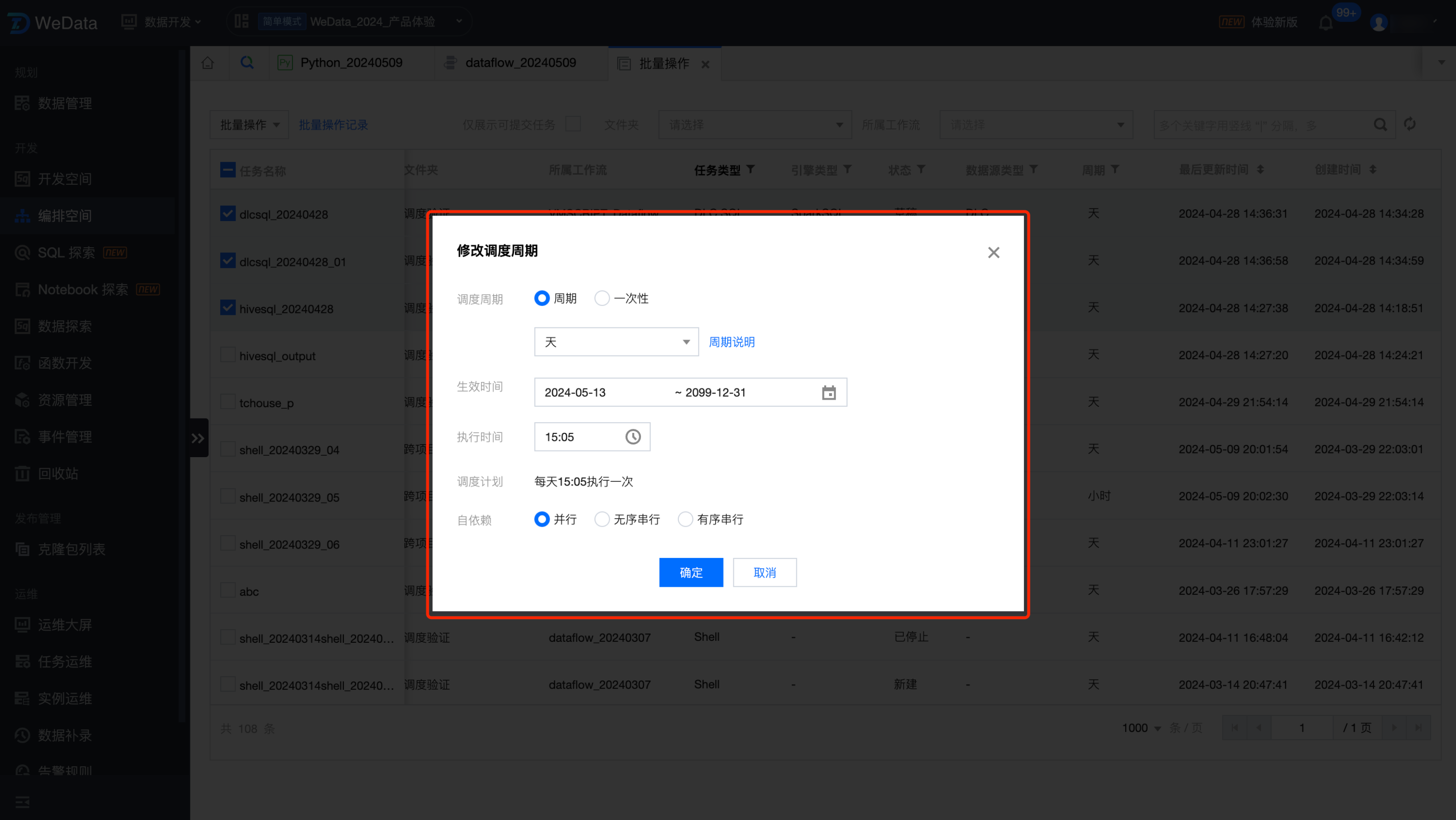 您可以批量修改选中任务的调度周期,可以修改的内容跟任务的调度设置的调度策略一致。批量操作会将选中任务的调度策略修改为配置的调度策略。