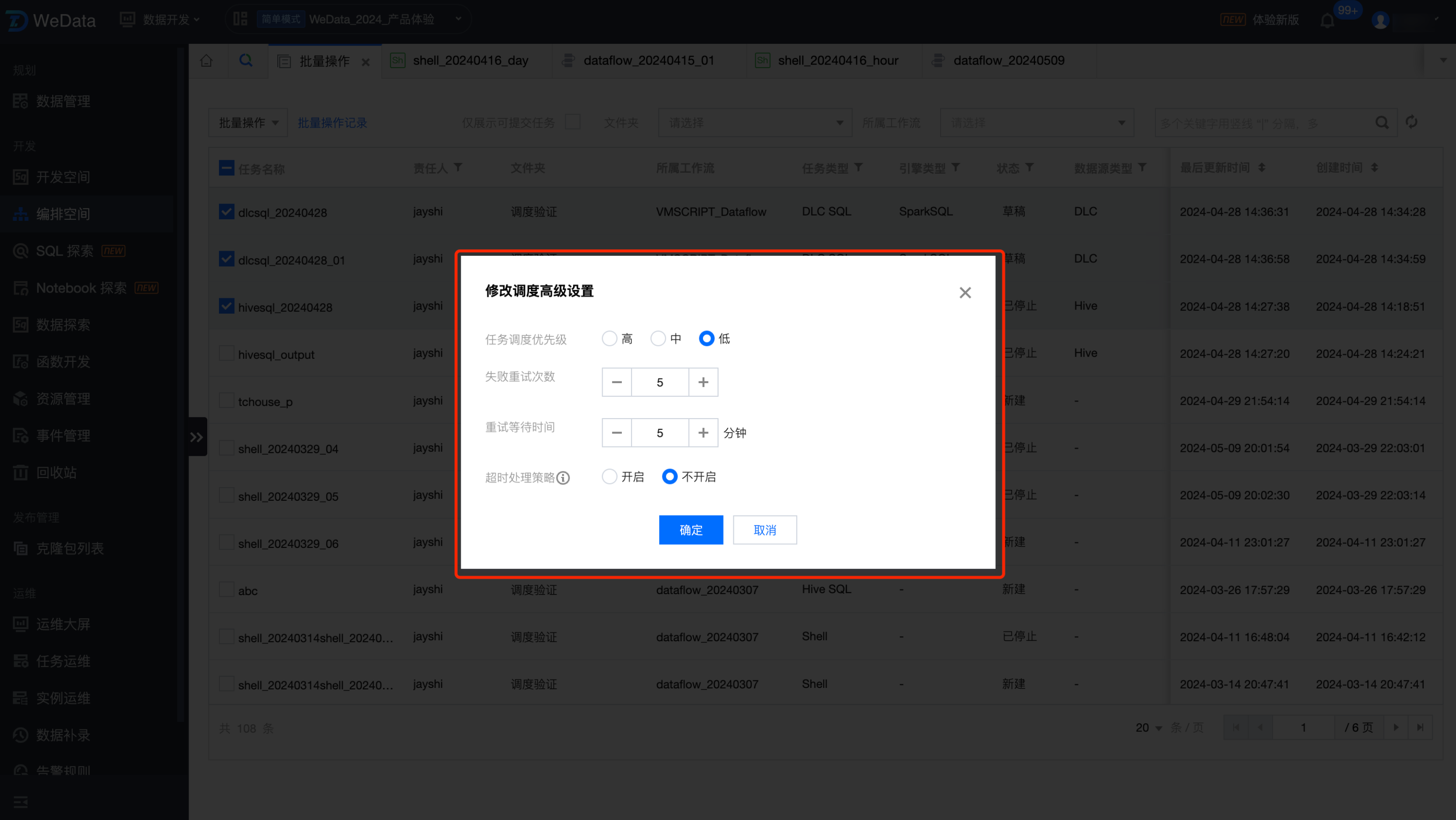 您可以批量修改选中任务的调度高级配置,可修改的内容跟任务的调度设置-高级设置一致。批量操作会将选中任务的调度高级设置修改为配置的内容。