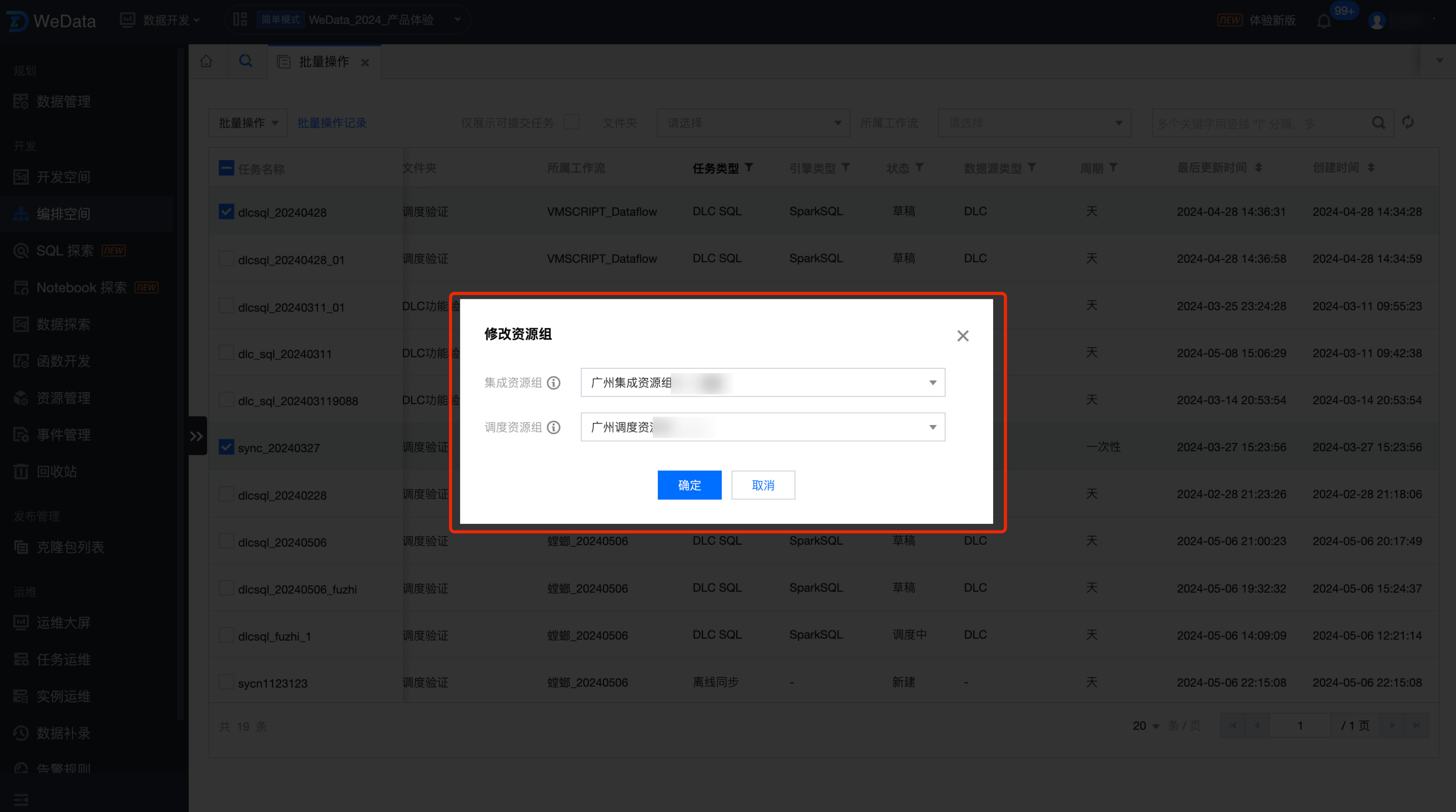 可以批量修改选中任务的集成资源组和调度资源组。系统会自动判断选中的任务中是否有数据计算任务和集成任务,如果有对应类型的任务,会自动弹出调度资源组和集成资源组的选项。会将选中任务的调度资源组和集成资源组修改成对应的资源组。