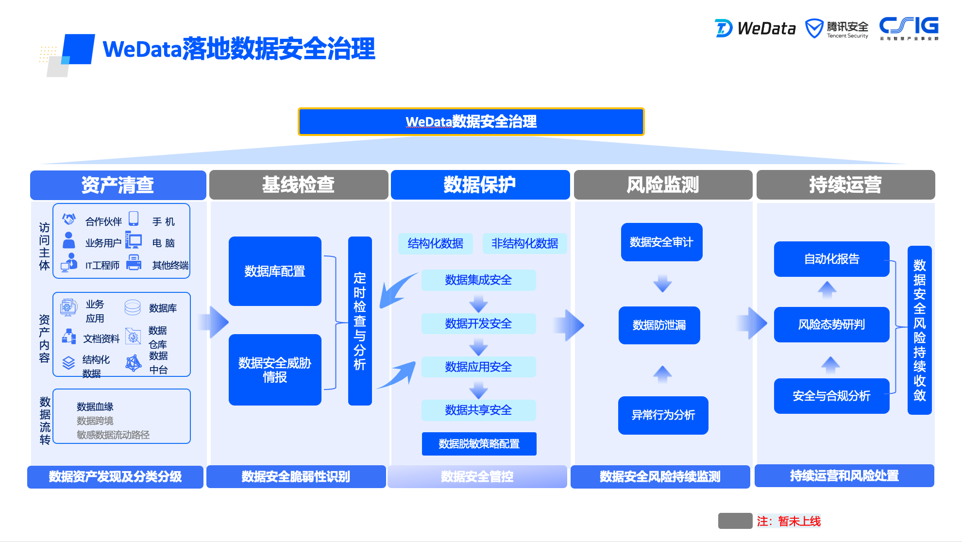 持续运营 (暂未上线) | WeData 提供风险处理与告警机制,包括风险处理通知,风险处理告警,风险处理报告等功能,通过风险问题的持续监测和处理,不断改善企业数据安全问题。 |