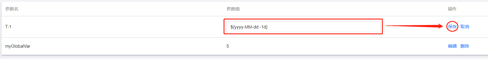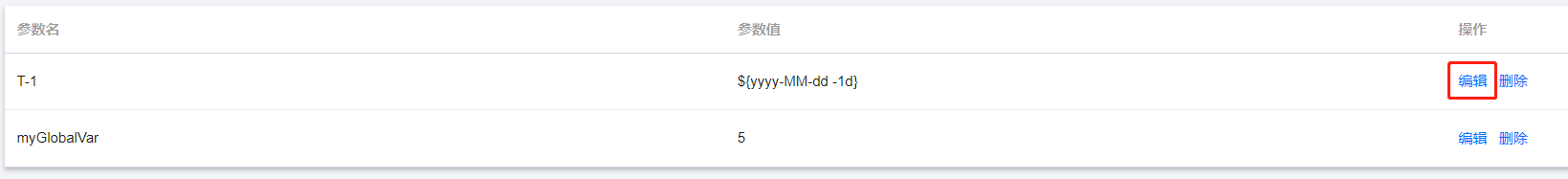 提供编辑功能修改列表中的变量参数。选中需要修改的变量,单击其操作列下的 编辑 按钮可以修改参数值,修改完成后再单击 保存 按钮即可完成变量编辑。