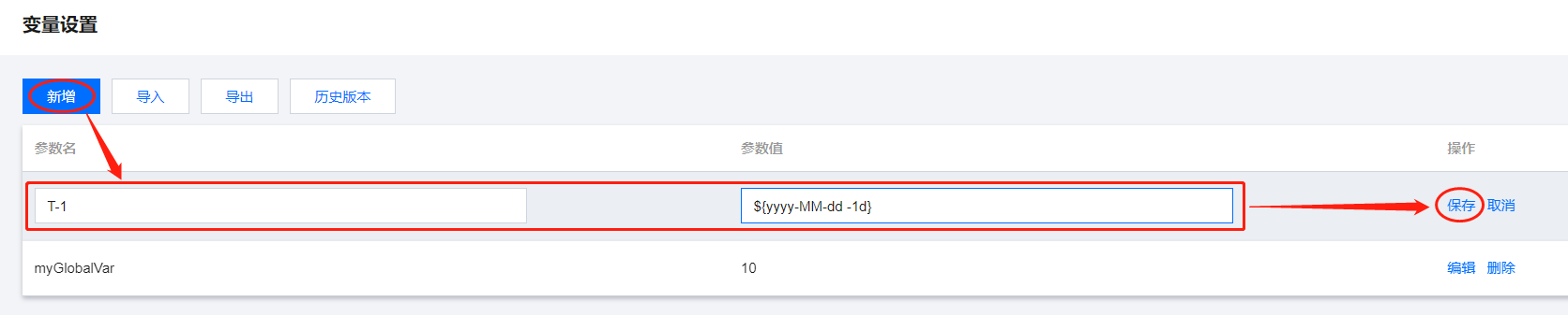 例如:新增一个获取前一天日期参数变量。