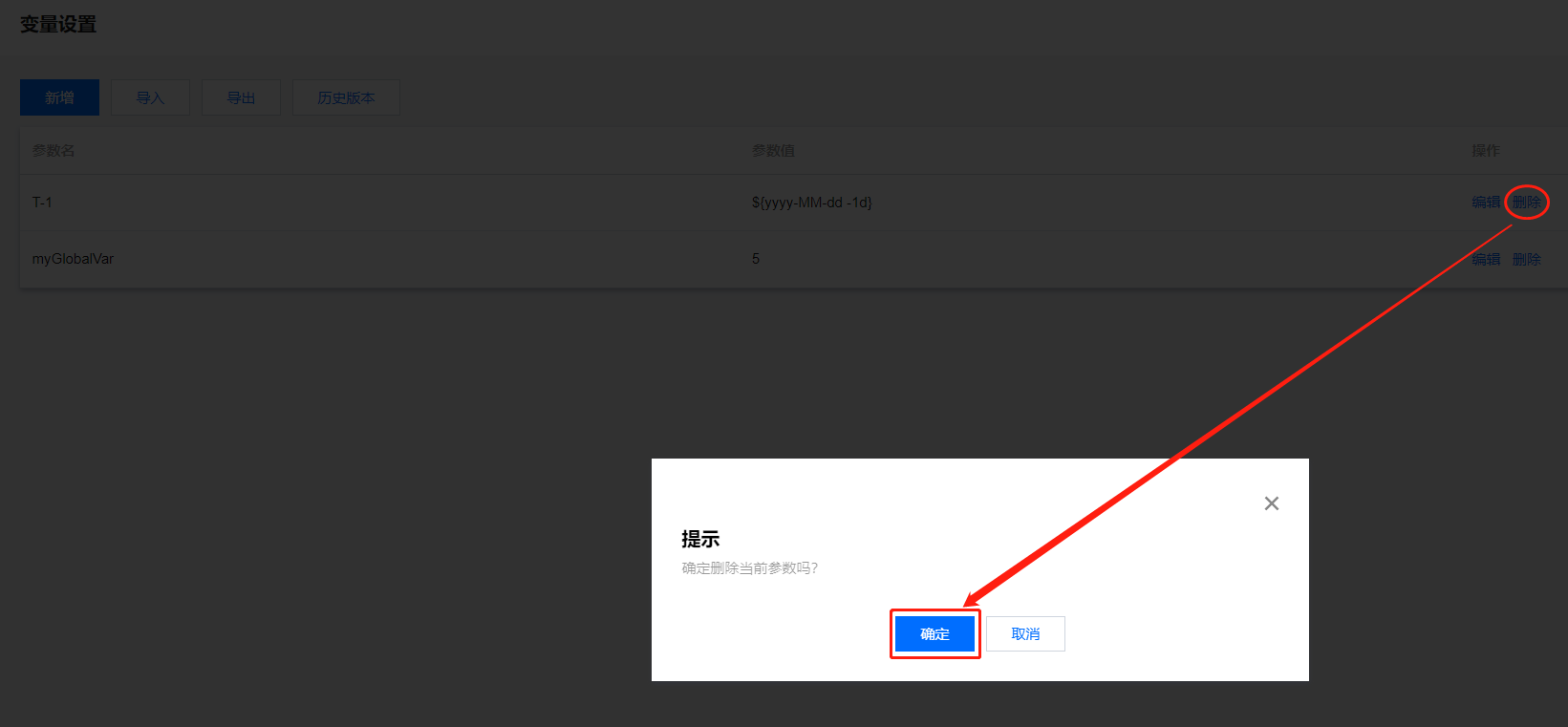 提供删除功能可以将列表中已创建的变量参数删除。选中需要删除的变量,单击其操作列下的删除按钮,在弹框中进行确认后即可删除该参数。