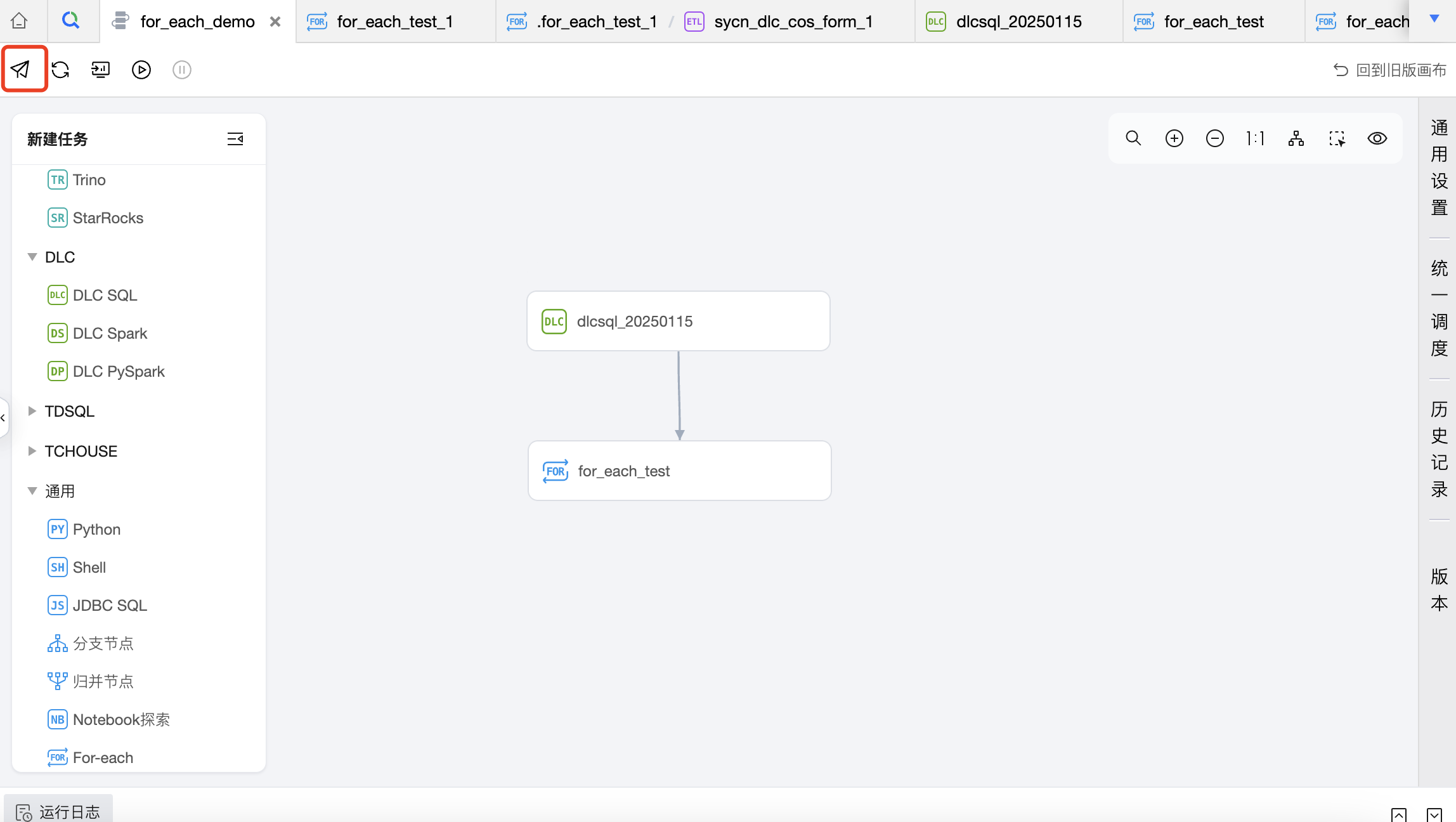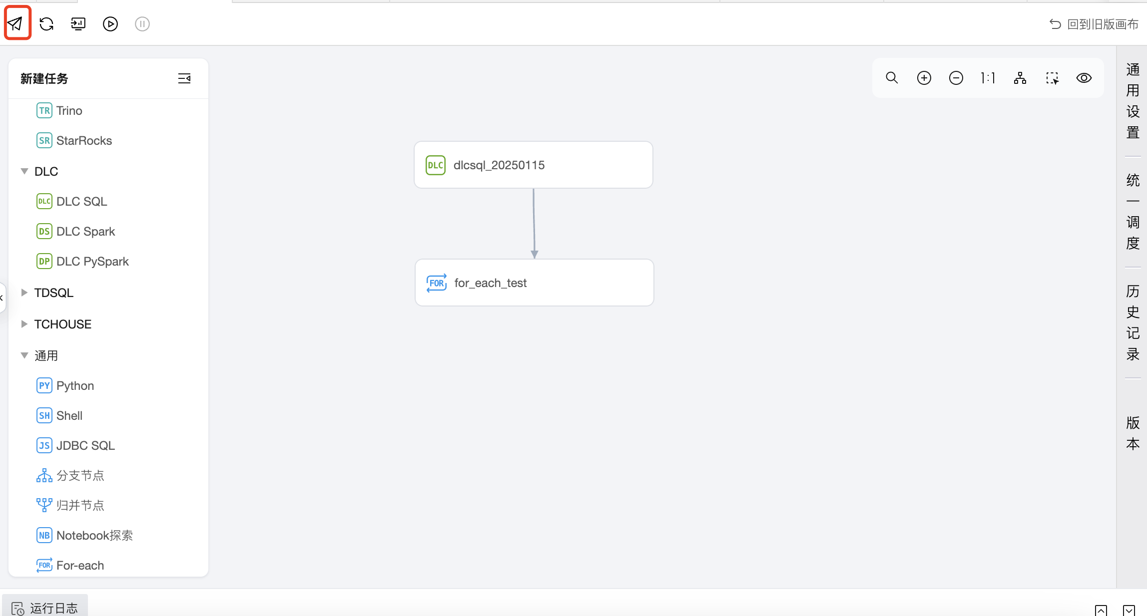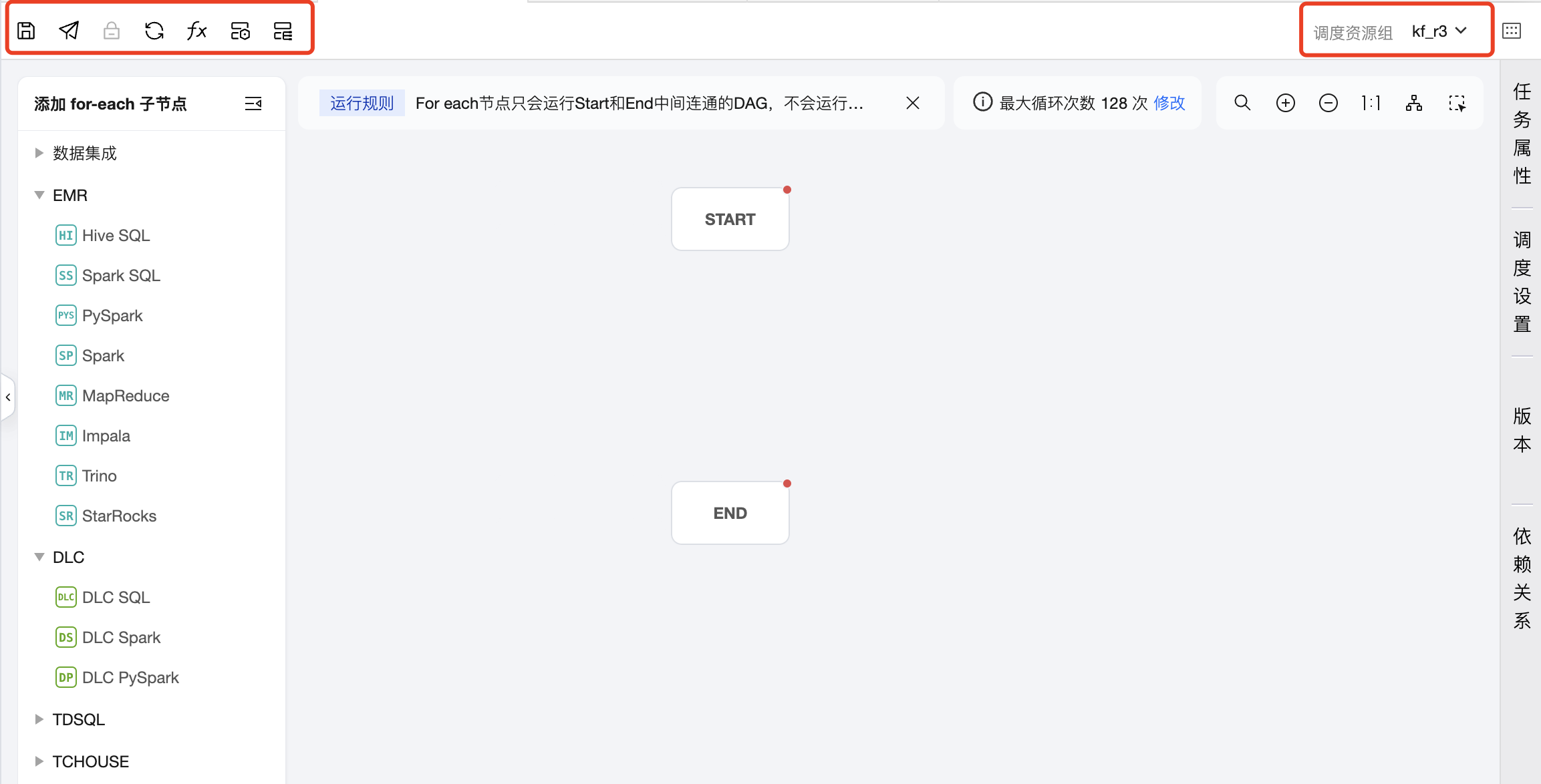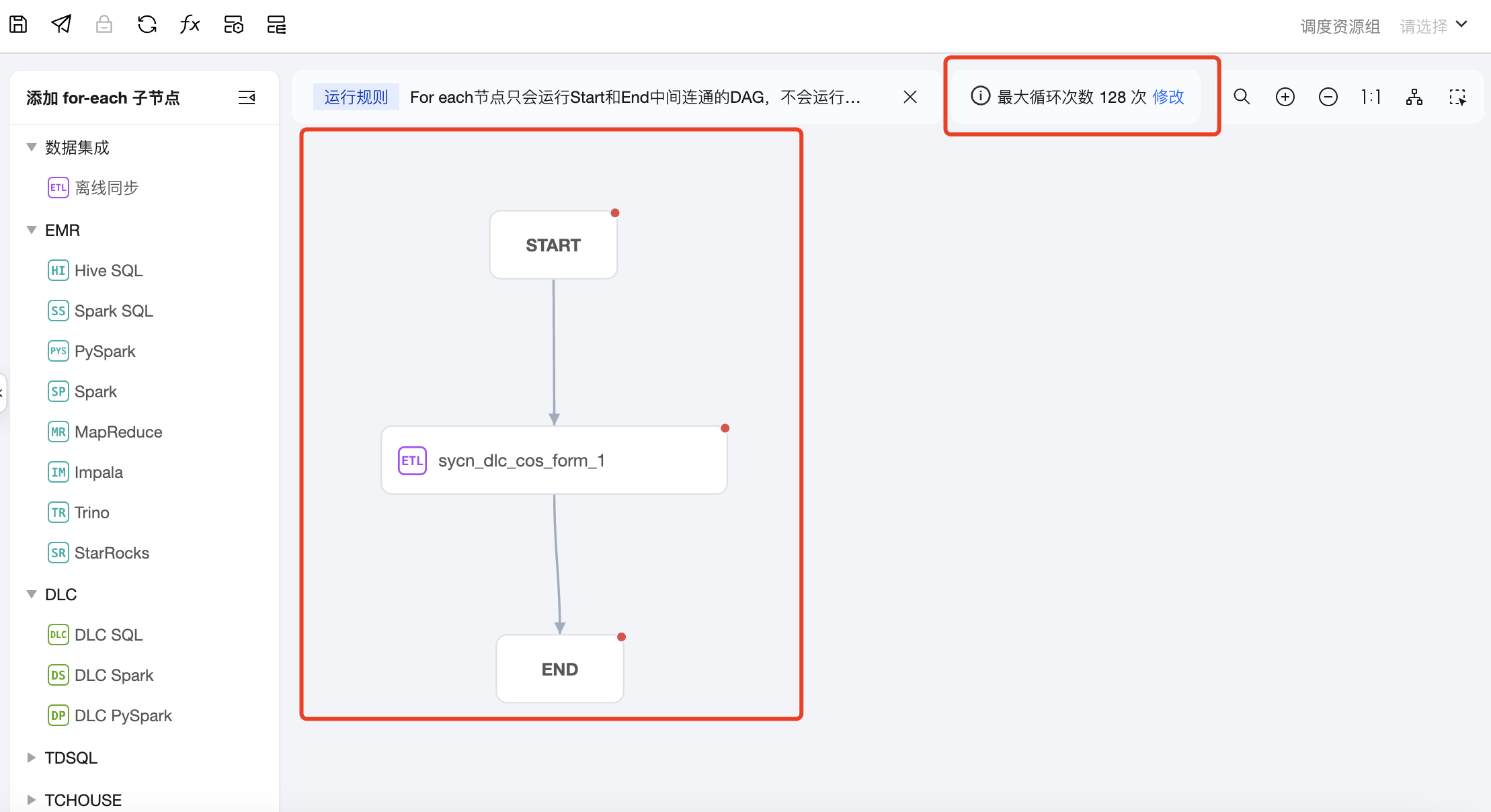 任务类型:单击左侧任务类型可添加子节点,在画布区域可以对子节点进行编排,并建立上下游关系。For-each 节点只会运行 START 和 END 中间连通的 DAG,不会运行非联通或者分叉的 DAG 部分,因此需要将想循环执行的节点放在 START 节点和 END 节点中间,并进行连线。