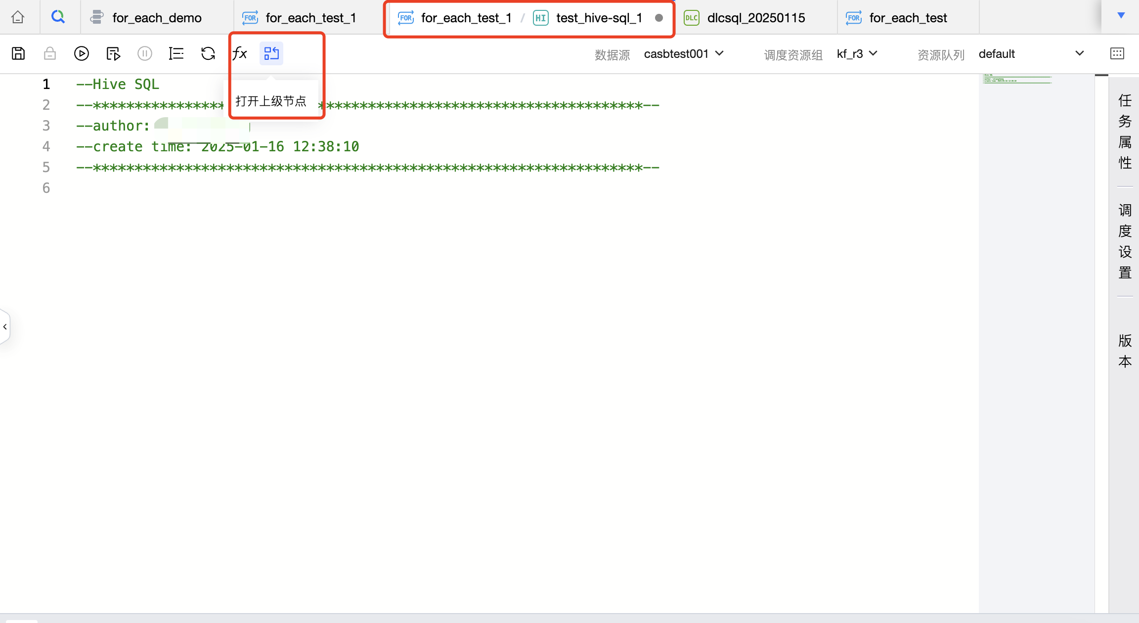 For-each 节点不提供测试运行、高级运行、终止运行等操作,若需要验证 For-each 节点是否符合预期,可在配置好后提交到运维中心进行测试执行。