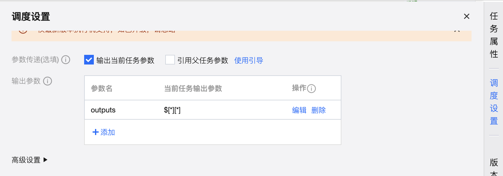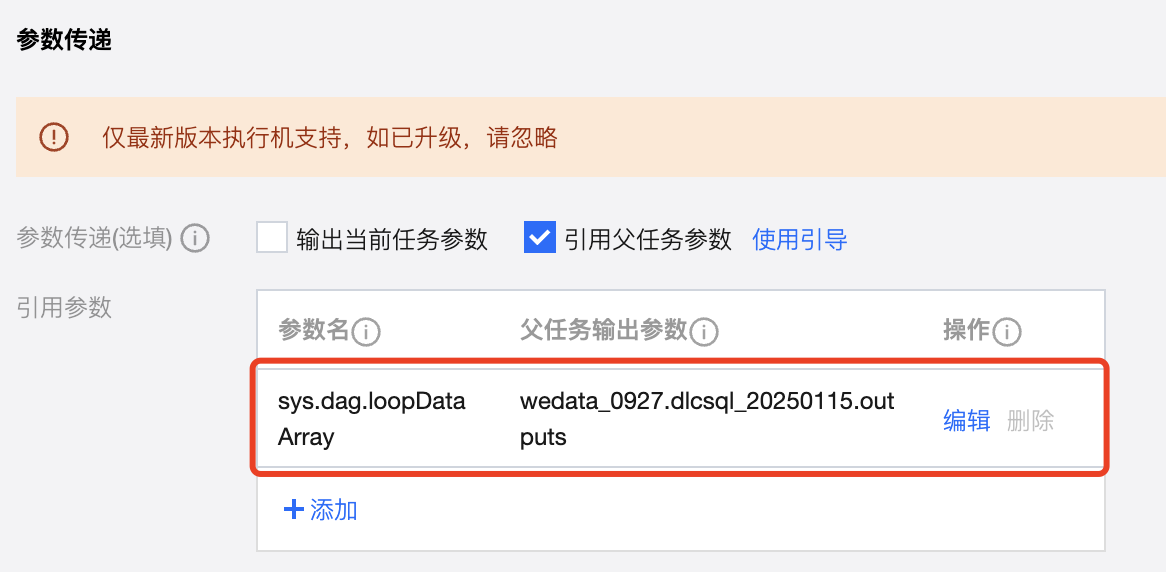 其中参数传递默认需要从上游获取传递的参数,且默认参数名称为:sys.dag.loopDataArray。该参数用于运行时的循环遍历,若未配置则任务将无法提交。