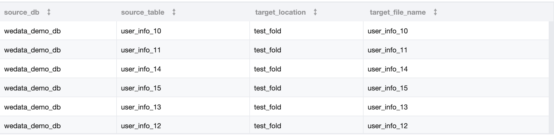 DataLakeCatalog.wedata_demo_db.user_info_10 | COS:/Bucket Name/dlc_write_form/test_fold/user_info_10.csv |