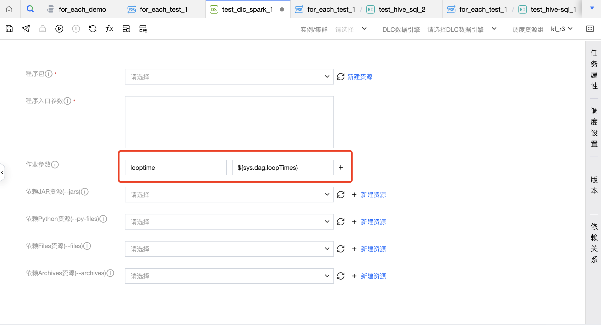 非脚本类子节点 | 非脚本任务节点:EMR-Spark、TCHouse-X、DLC Spark、DLC PySpark、MapReduce支持使用内置变量,具体可配置项为: EMR-Spark-jar:程序入口参数、应用参数、作业参数。 EMR-Spark-zip:执行参数、应用参数 TCHouse-X:程序入口参数、作业参数 DLC Spark:程序入口参数 DLC PySpark:入口参数、依赖资源、conf 参数 MapReduce:输出目录、命令行参数 | |