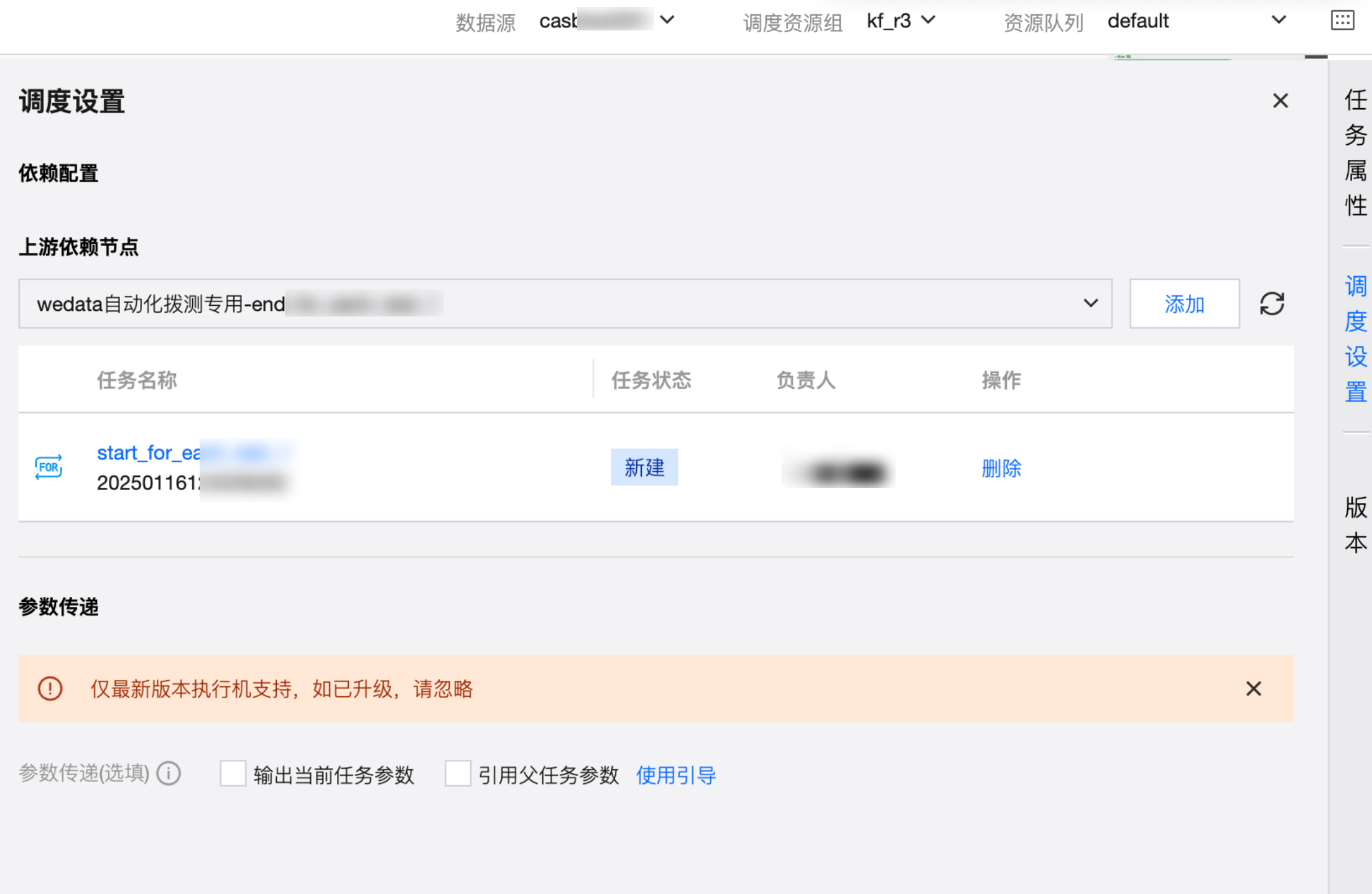 For-each 的子节点的调度设置支持配置上游任务和参数传递。