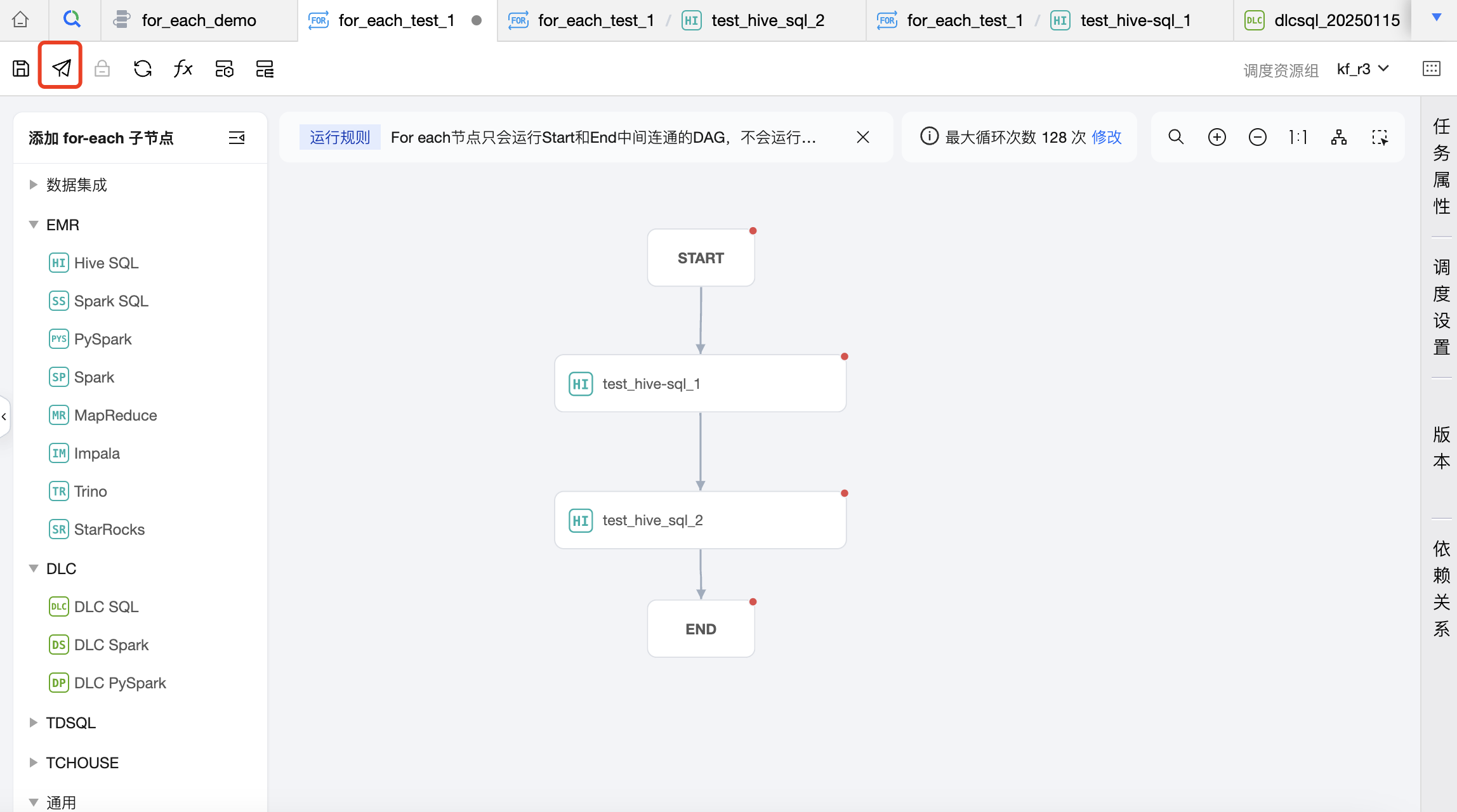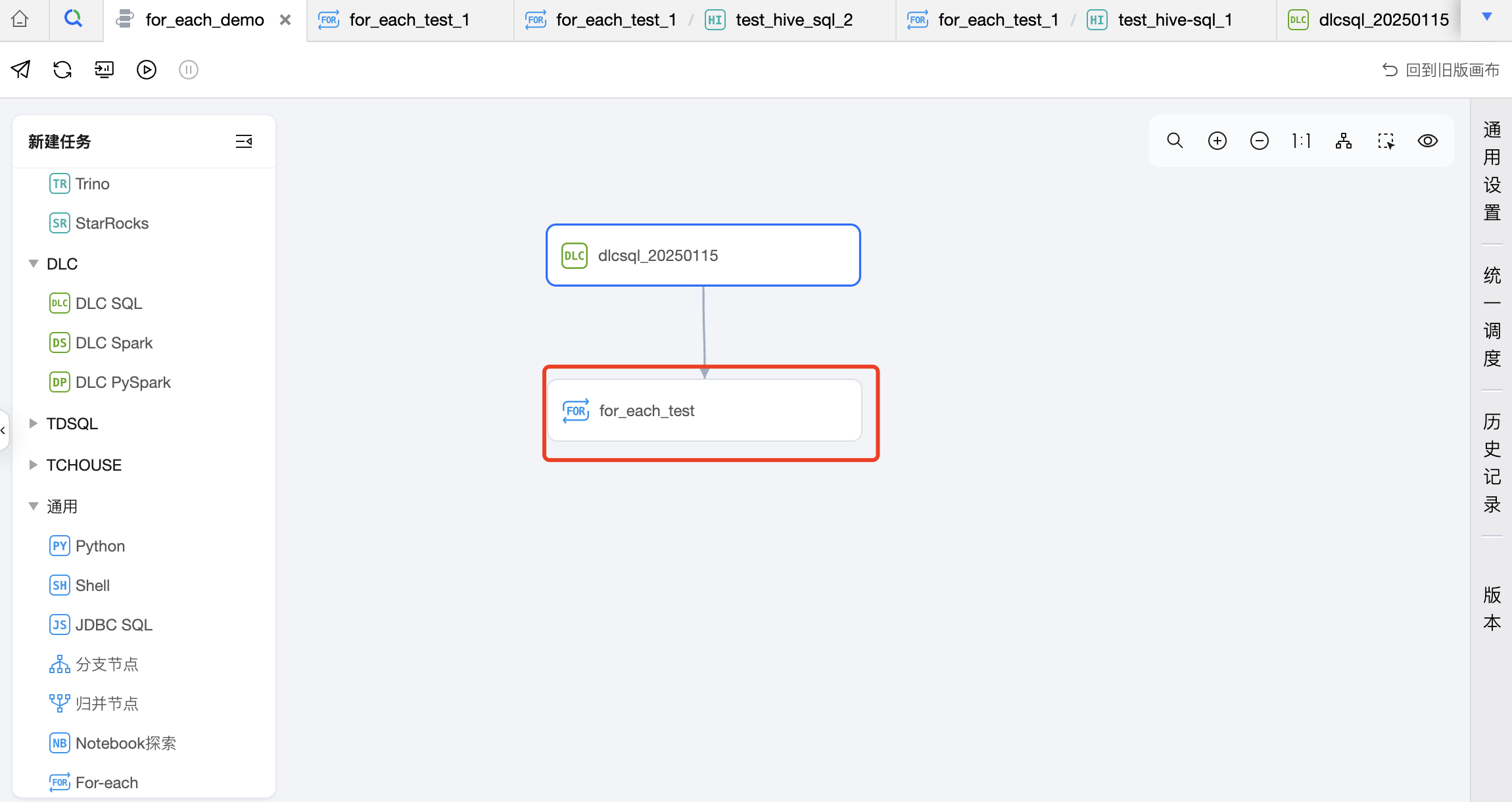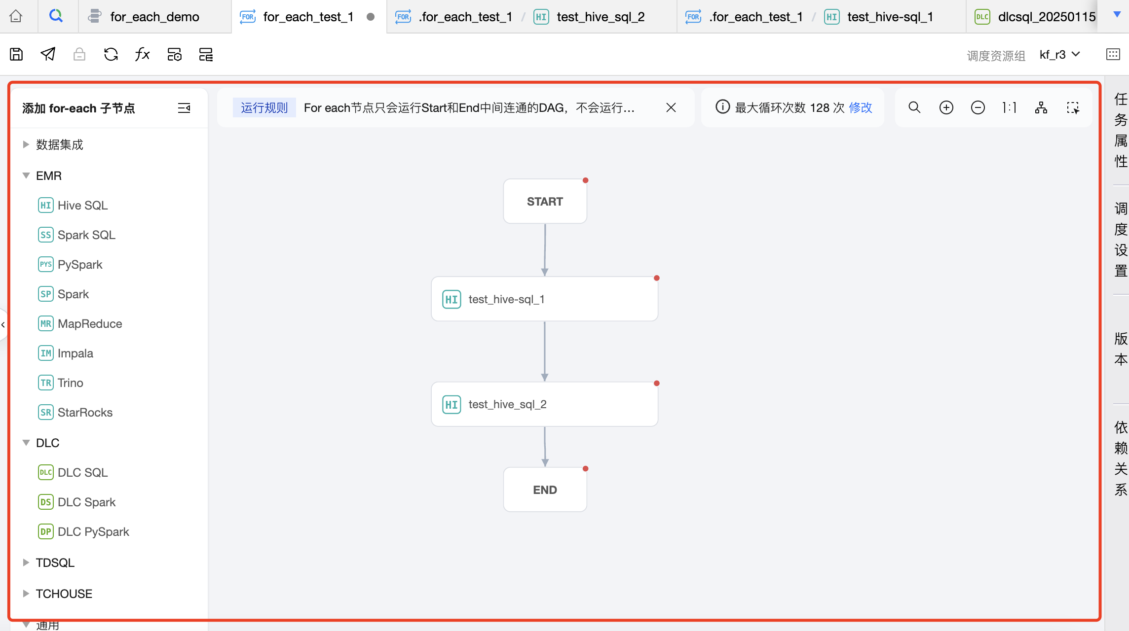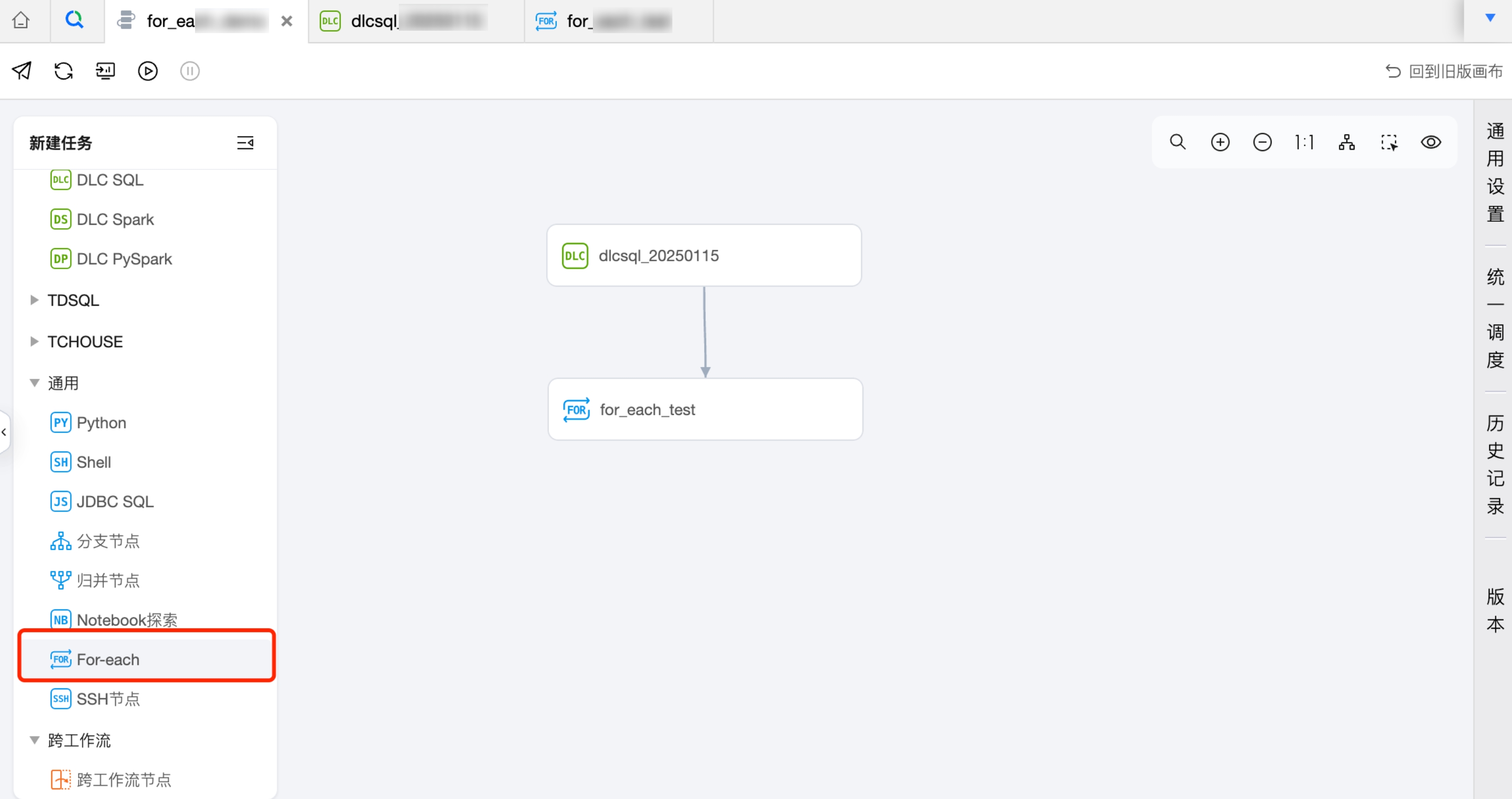 1. 在工作流中创建一个 For-each 节点,并与 DLC SQL 任务建议上下游关系。