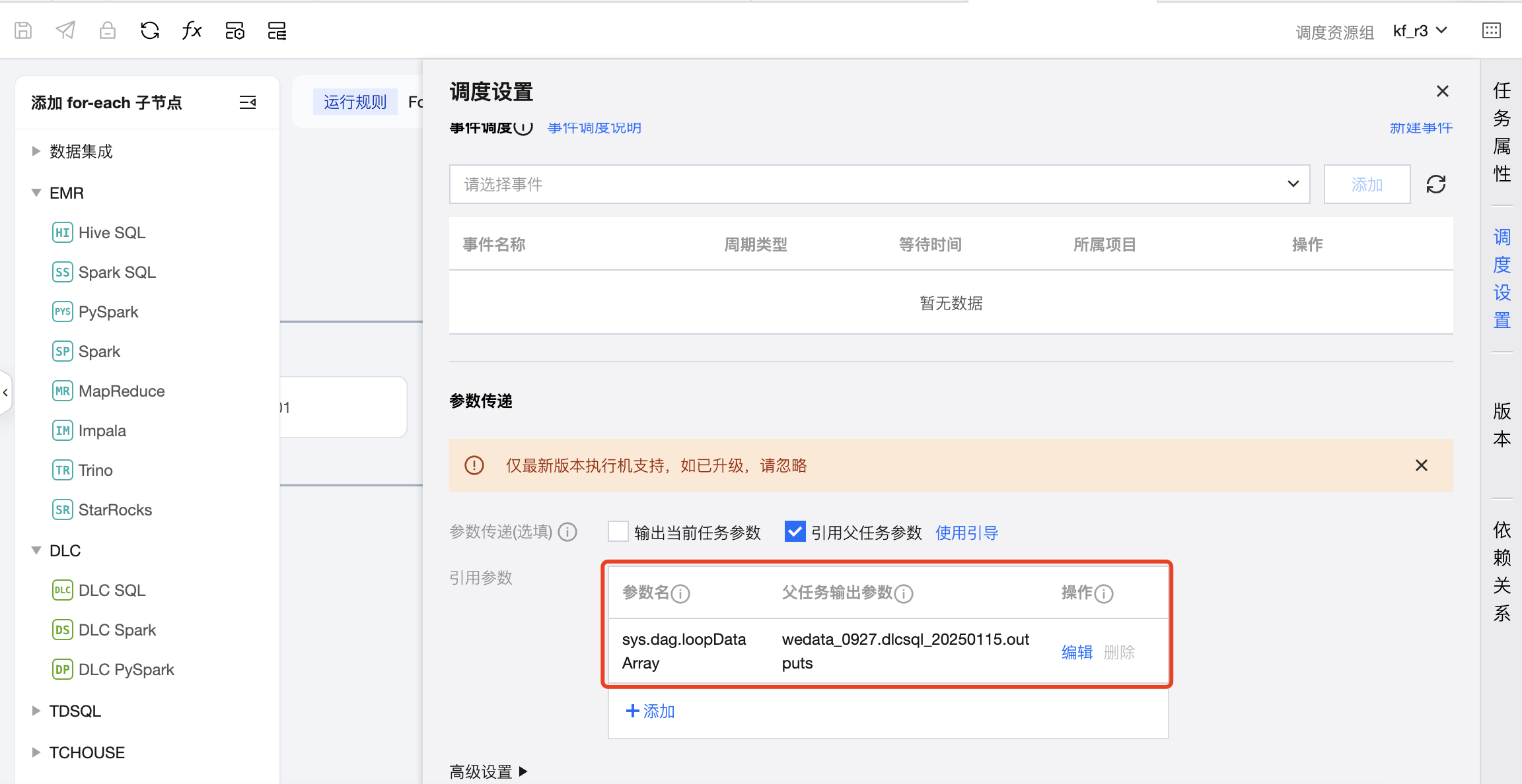 配置 For-each 任务的基础信息和调度信息,其中重点需要配置引用父任务参数,在参数传递模块定义参数并配置父任务输出参数,从上游 DLC-SQL 中读取传递参数。
