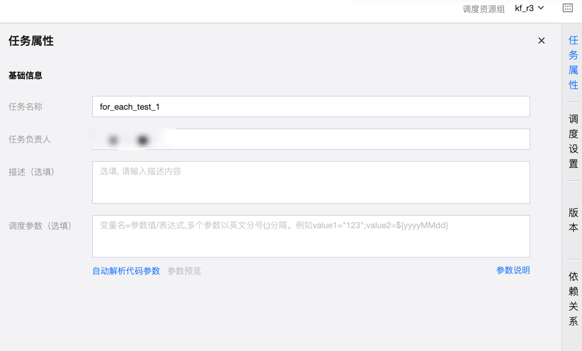 配置任务基本信息,包含任务名称、任务负责人、描述和调度参数。