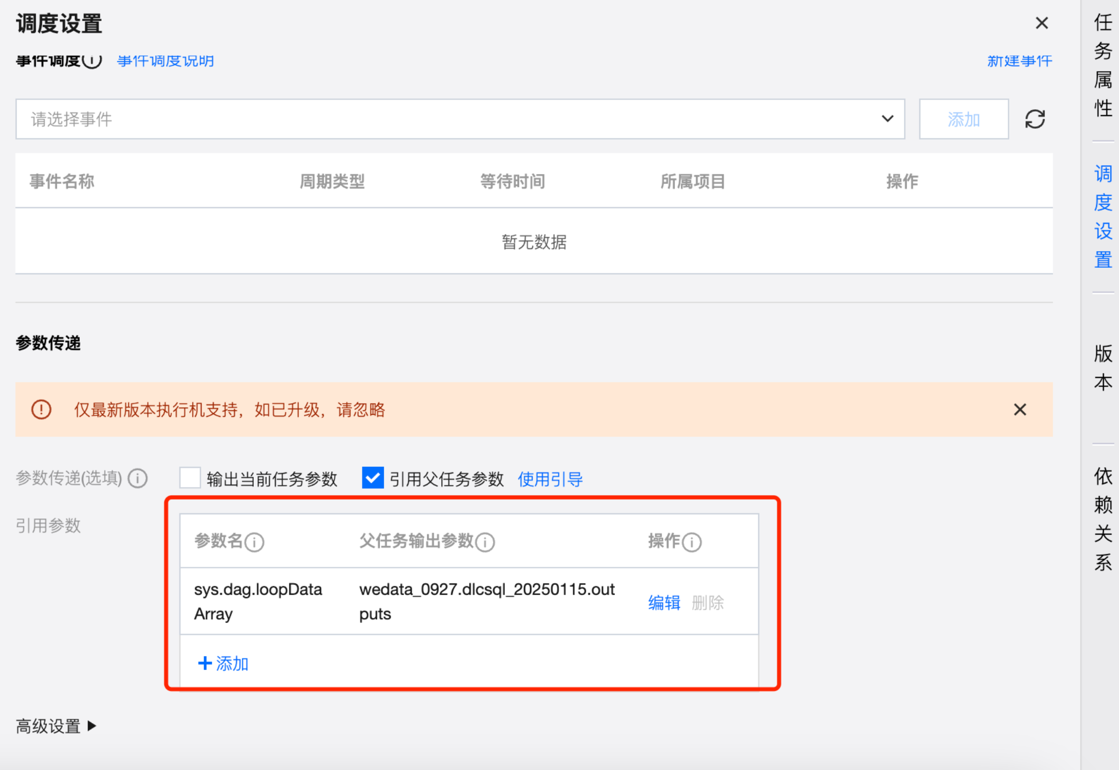 For-each 节点的调度设置与其他任务类型基本相同,支持为节点配置调度策略、上游依赖、事件依赖、参数传递、高级配置。
