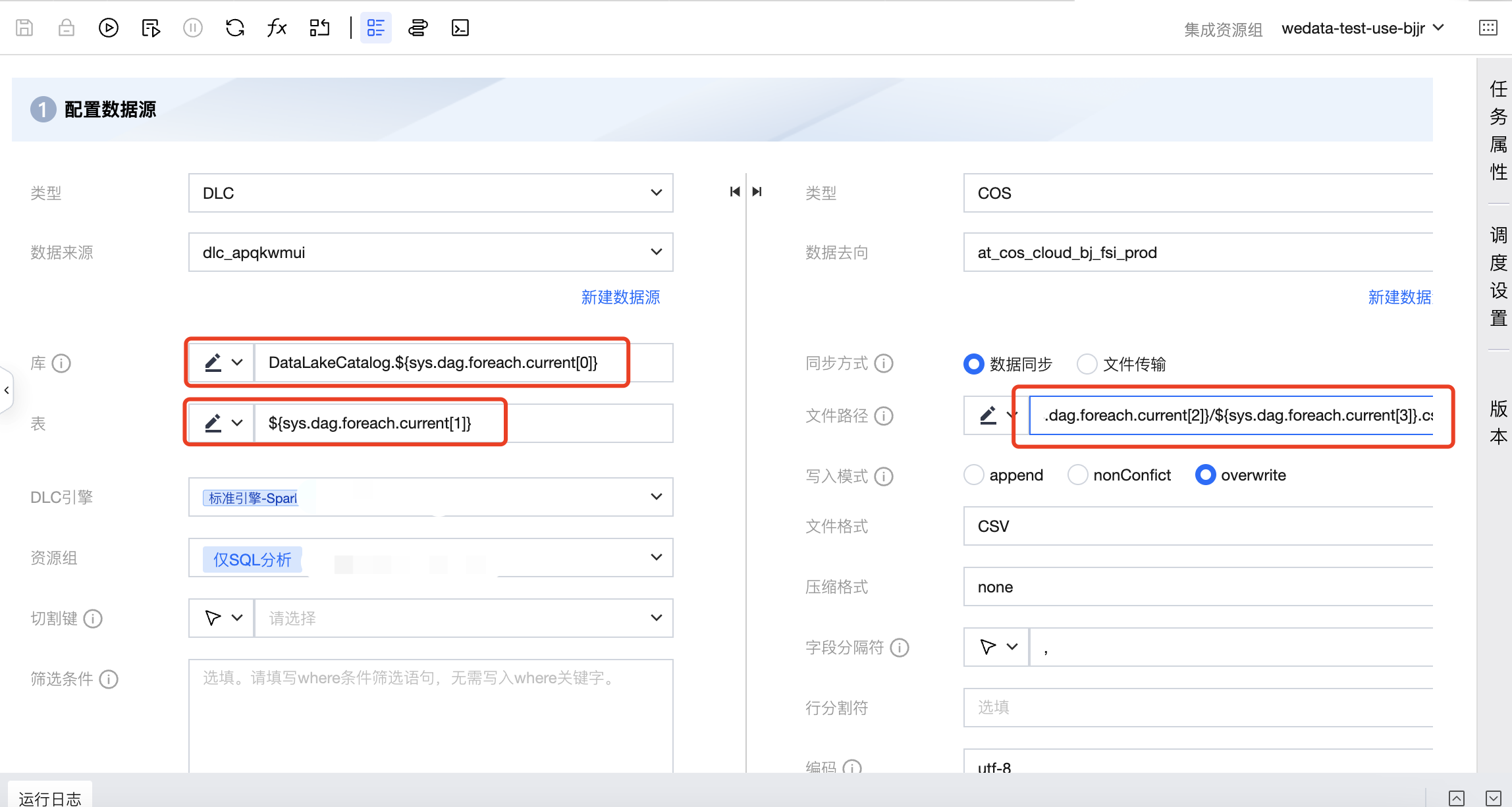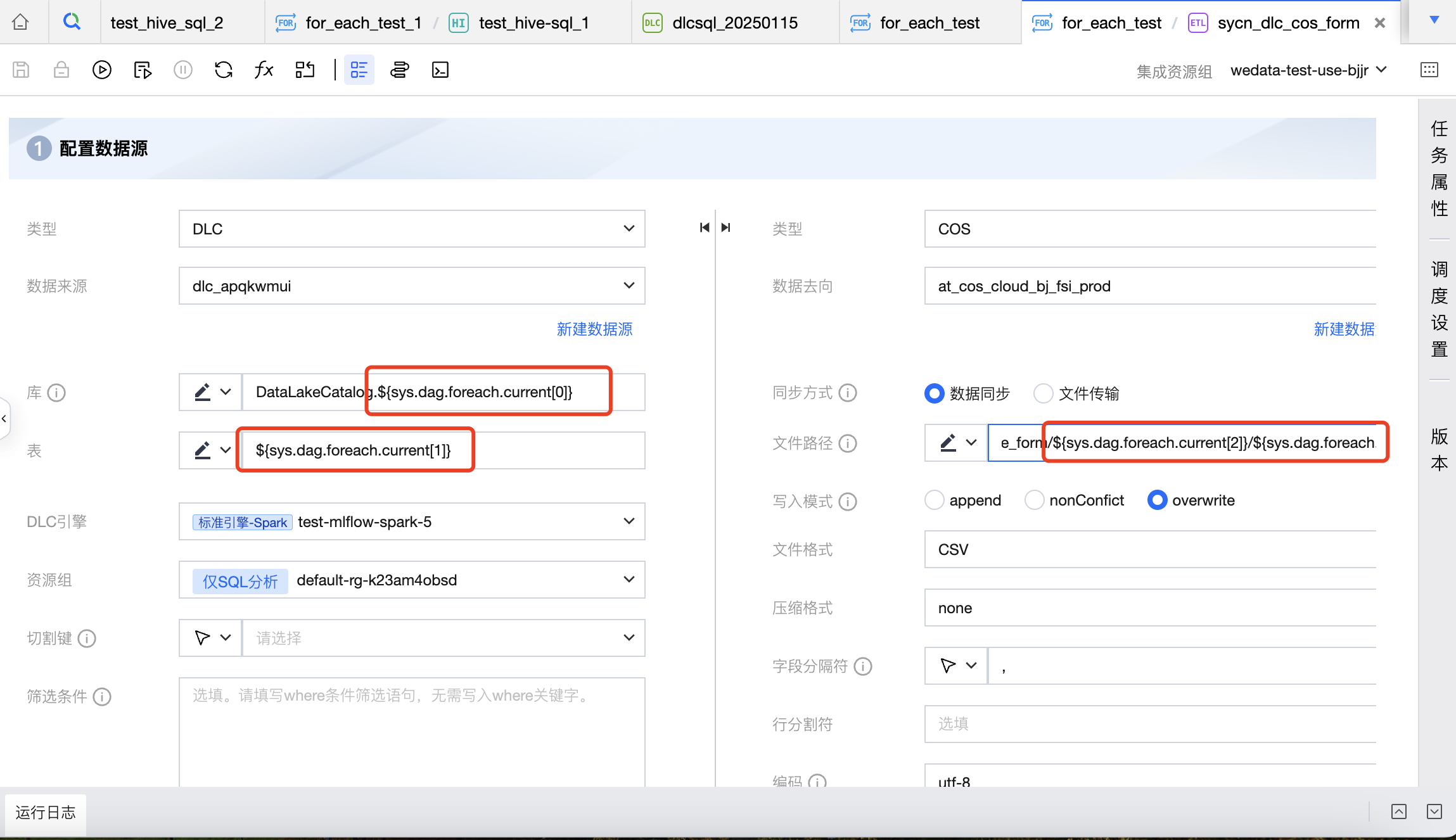 去向的 COS 路径配置为:COS:/Bucket Name/dlc_write_form/${sys.dag.foreach.current[2]}/${sys.dag.foreach.current[3]}.csv,表示每次遍历的 COS 路径都是动态变化的,这里使用了本次遍历对应行的第2、3列数据进行拼接获取最终的 COS 路径。