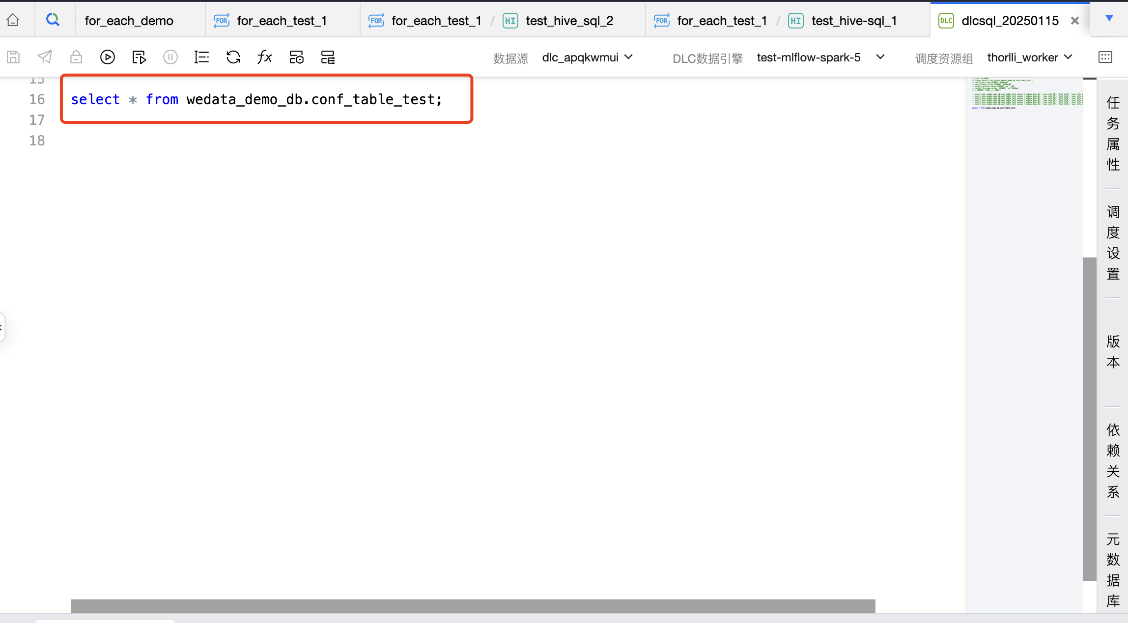 1. 将数据集成来源库存信息、来源表信息、去向库信息、去向表信息存储在一张 DLC 表 wedata_demo_db.conf_table_test 中。创建一个 DLC SQL 任务,在 DLC SQL 任务中读取表 wedata_demo_db.conf_table_test 中的数据。