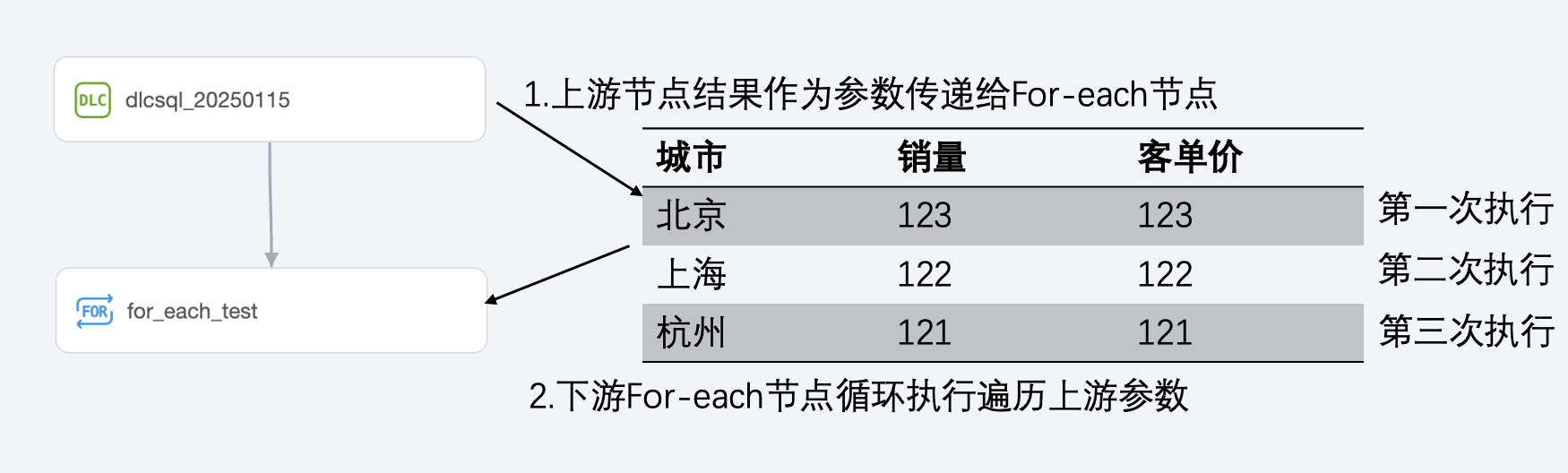 For-each 节点的最大循环次数为128次,实际循环次数依赖上游输出参数的行数。