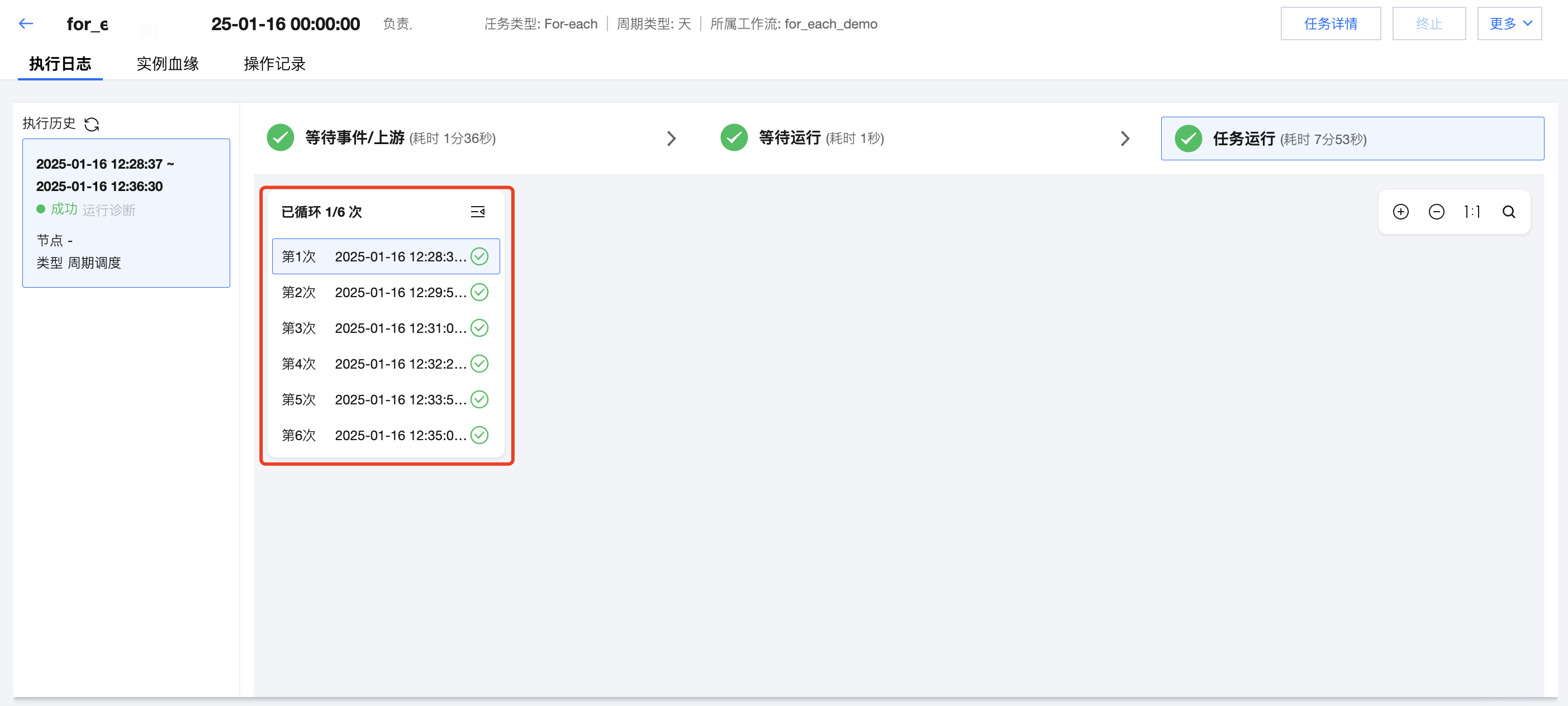 在运维中心的实例详情页可以查看 For-each 节点的运行情况。例如,这里上游 DLC SQL 传递了6行数据,因此这里 For-each 的子节点数据集成任务共执行了6次。