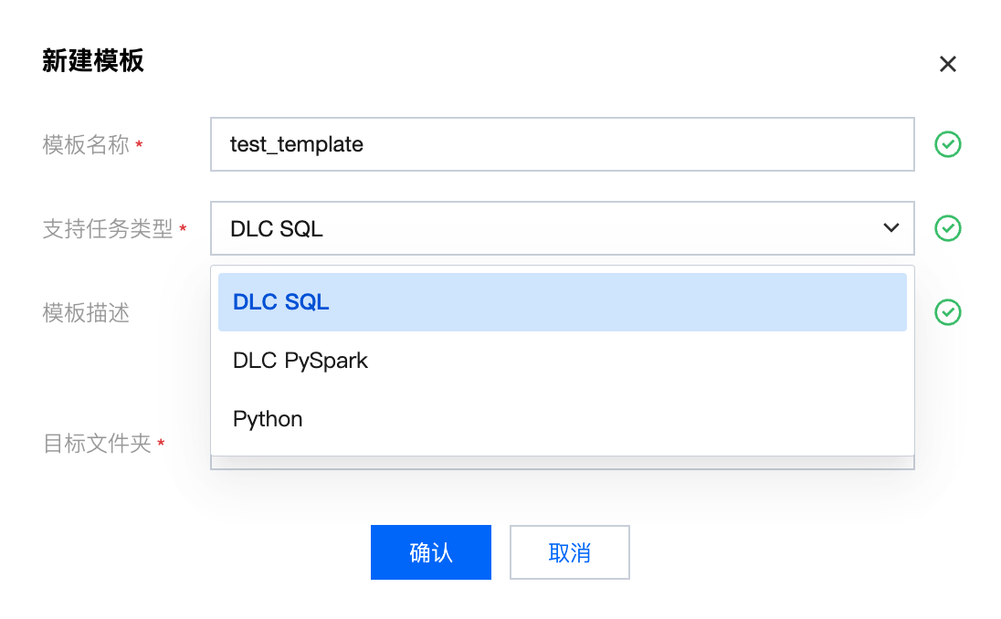 支持任务类型:当前支持任务 DLC SQL、DLC PySpark、Python,选择模板需要应用的任务类型。