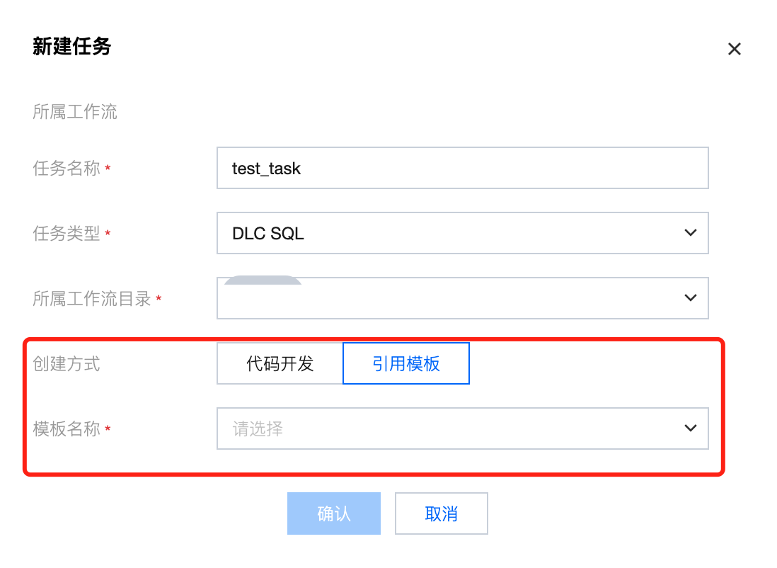 2. 新建任务时,若创建任务类型为 DLC SQL、DLC PySpark、Python,则可选择引用模板方式创建任务,引用模板后,任务的代码编辑器中将会展示模板的代码,且不支持修改。