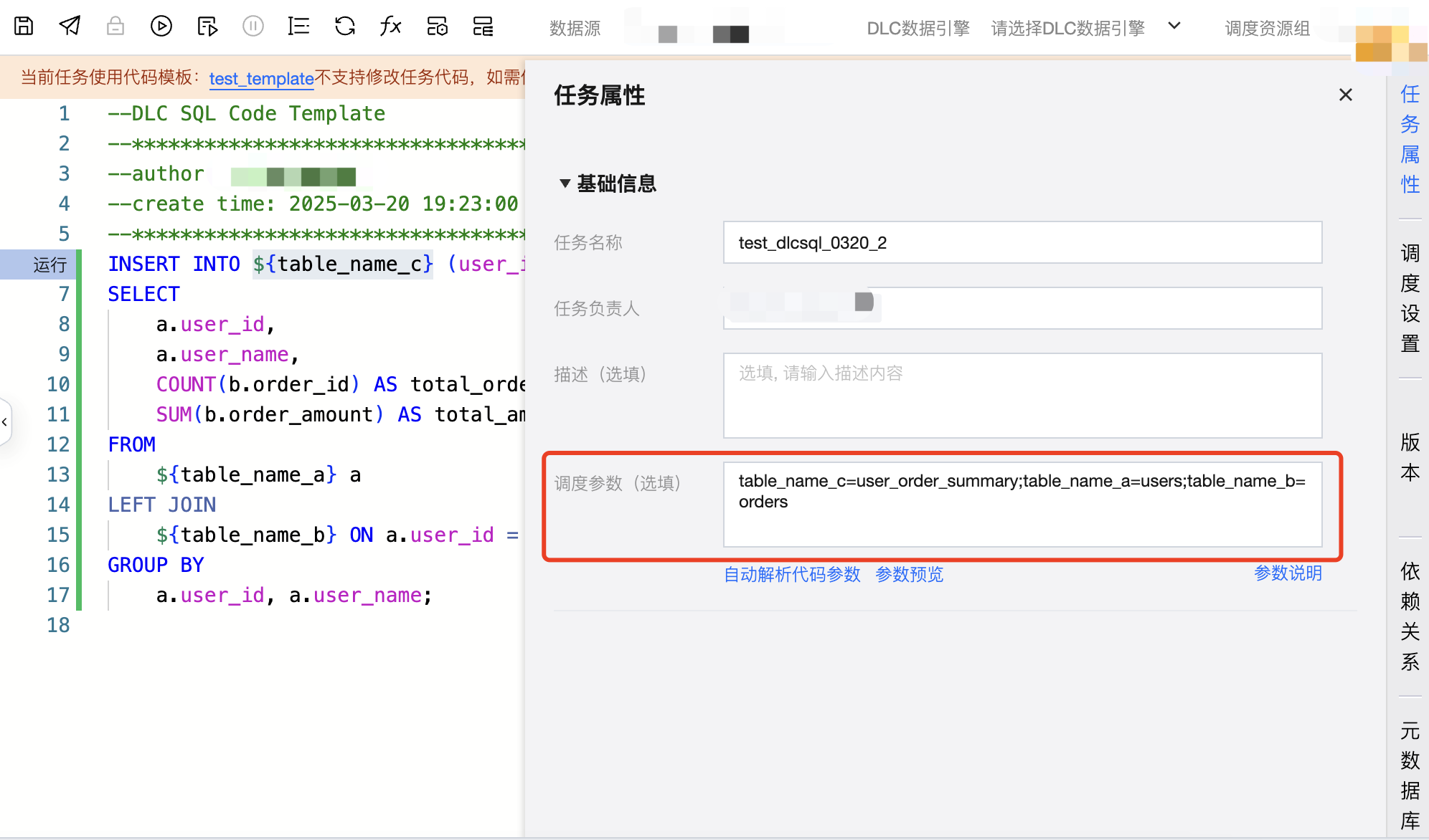 在任务属性 > 调度参数中,配置模板参数的值。
