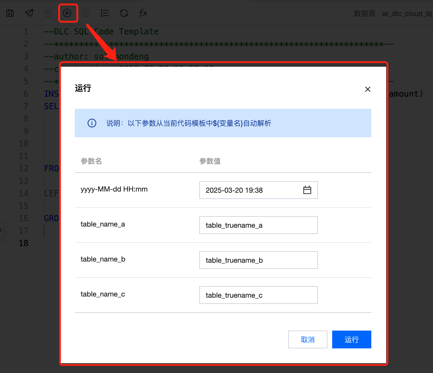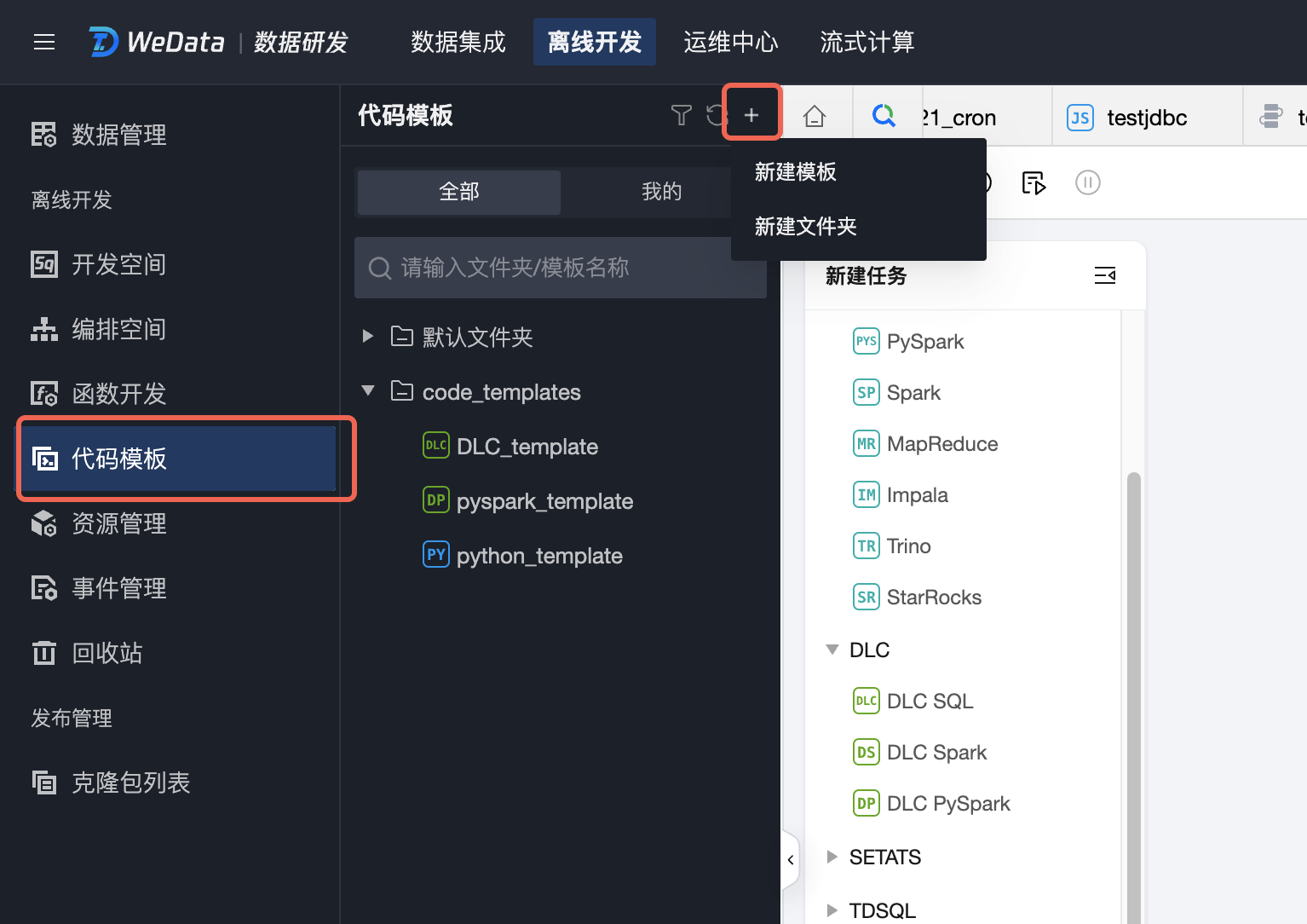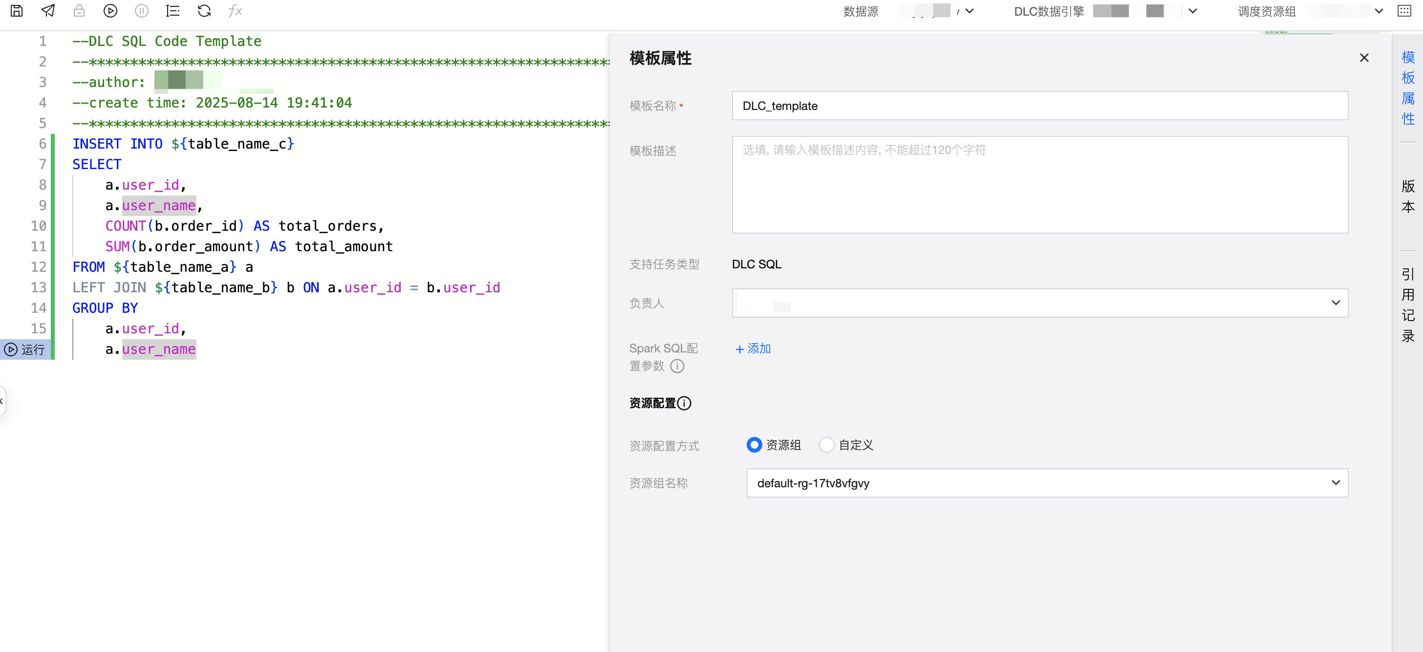 模板功能仅 DLC SQL、DLC PySpark、Python 三个任务类型支持。