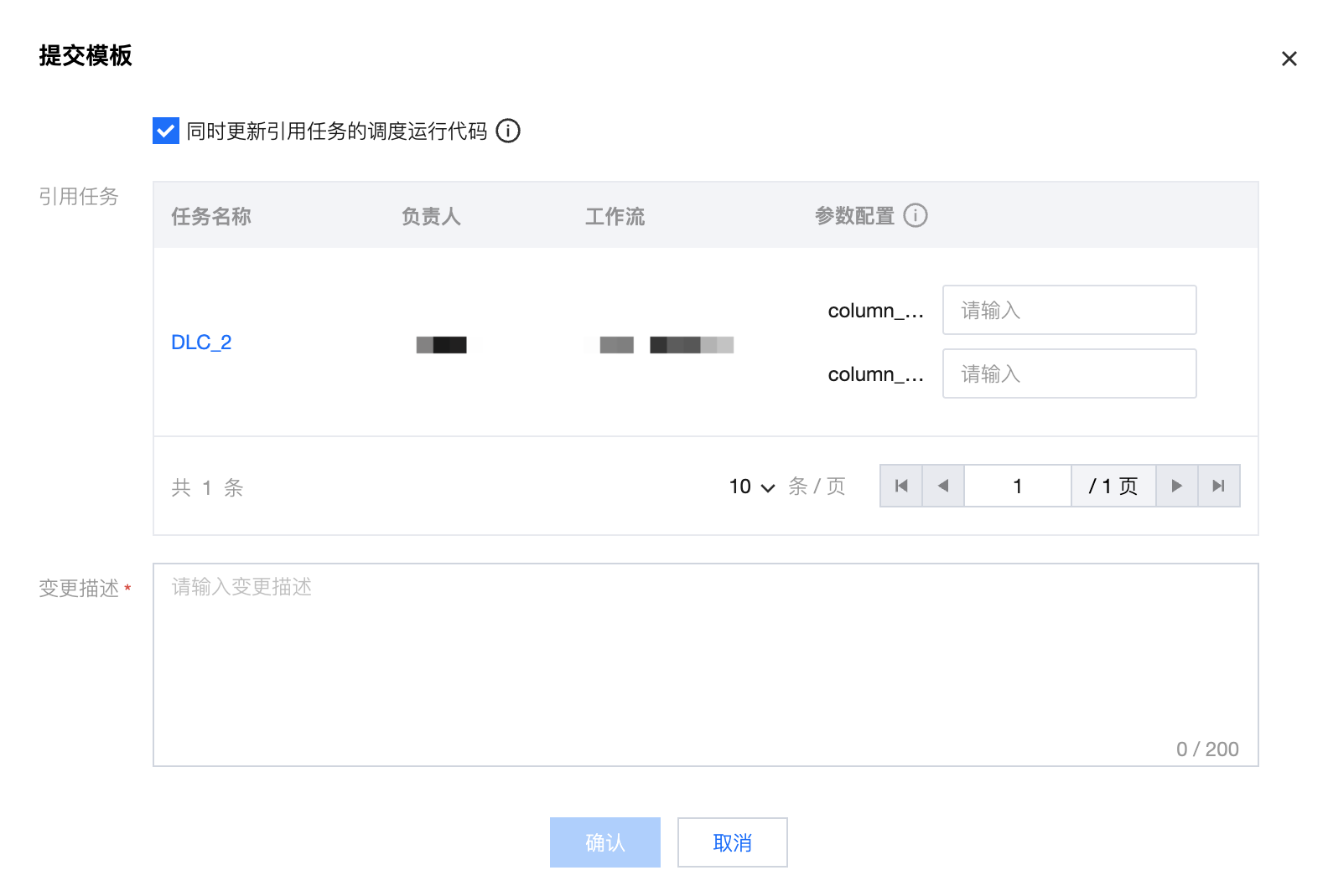 2. 提交:在更新场景中,提交代码模板若有参数的新增,您可以在提交时给引用代码模板的任务配置参数值,配置好的参数值会在提交时自动填充到对应任务的调度参数中,即您无需在重复提交任务。