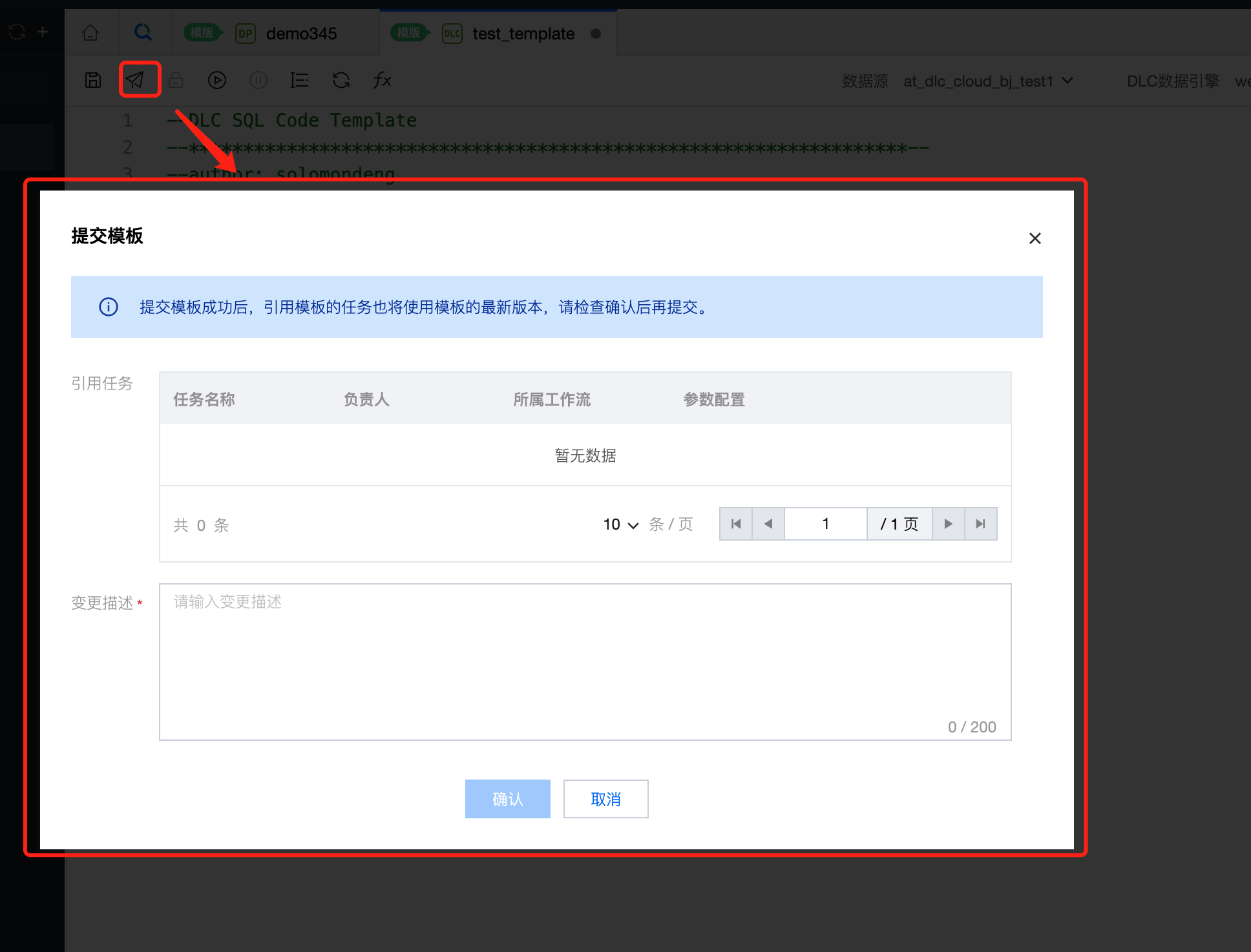 测试无问题后,即可进行提交。单击编辑器上方提交操作,完成提交。提交后引用模板的任务将在生产态使用模板最新版本的代码。