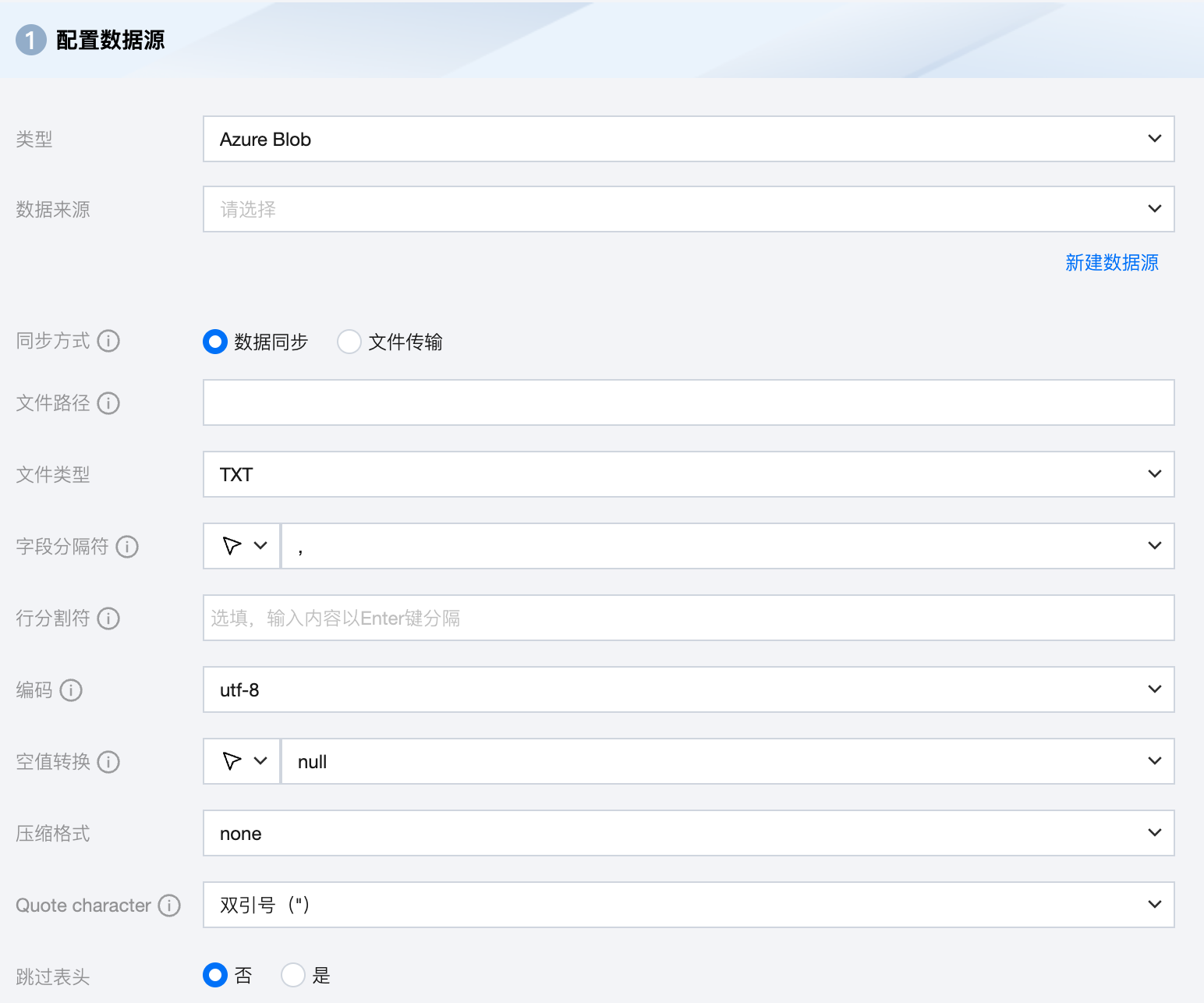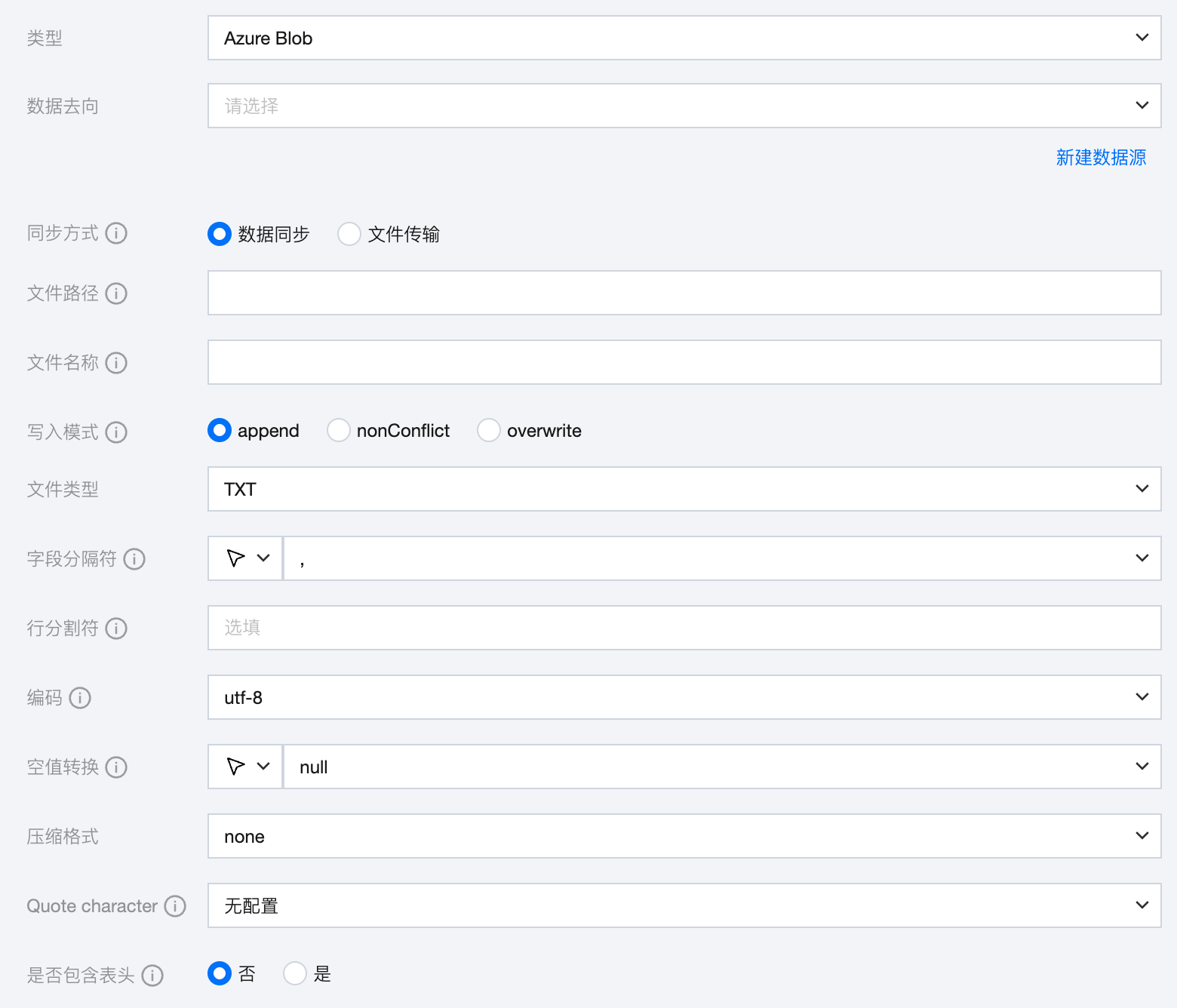 同步方式 | Azure Blob 支持两种同步方式: 数据同步:解析结构化数据内容,按字段关系进行数据内容映射与同步。 文件传输:不做内容解析传输整个文件,可应用于非结构化数据同步。 注意: 文件传输仅支持来源端、目标端均为文件类型(COS/HDFS/SFTP/FTP/Azure Blob/S3/Http)的数据源,且来源端、目标端同步方式均需要为文件传输。 |