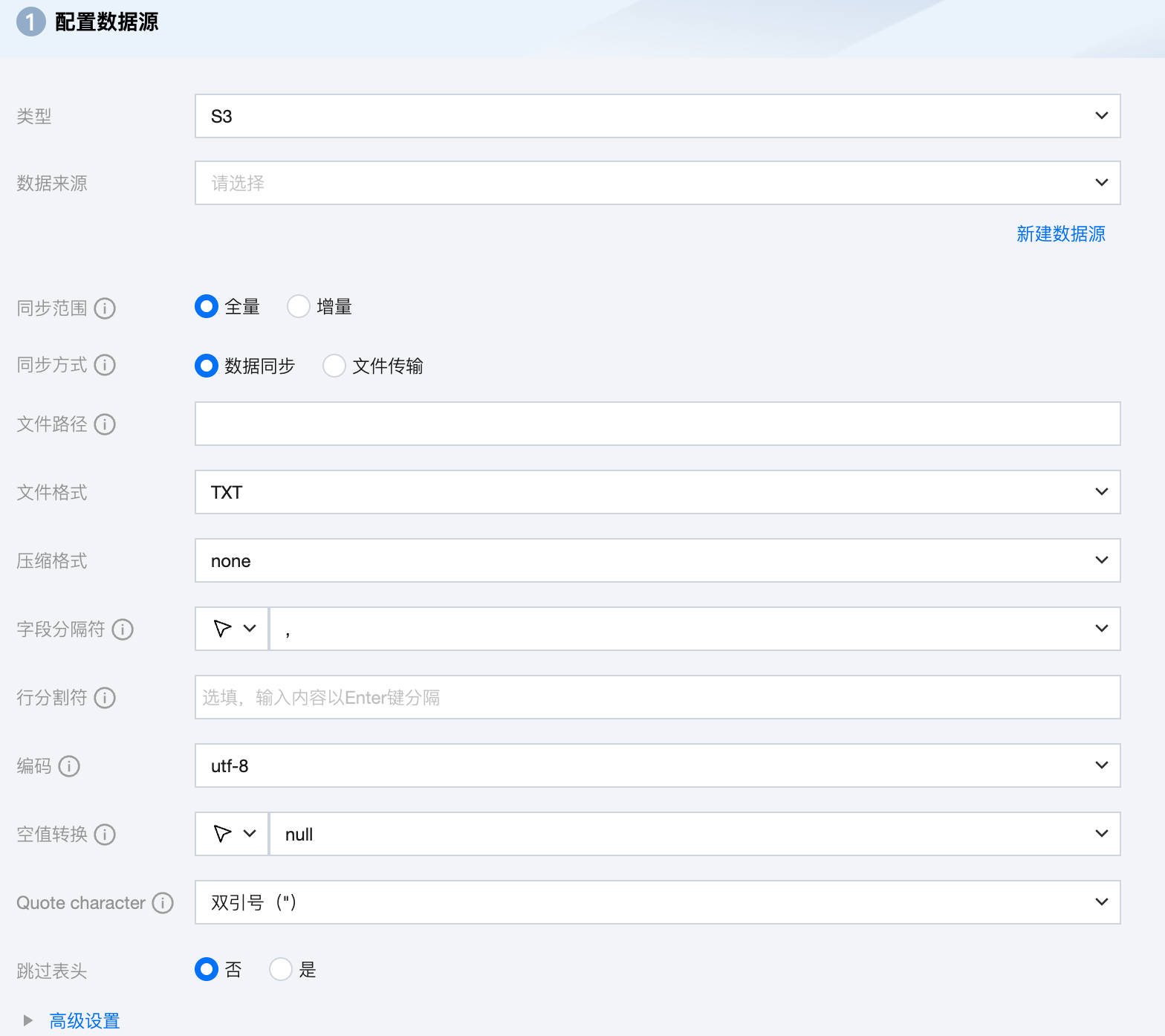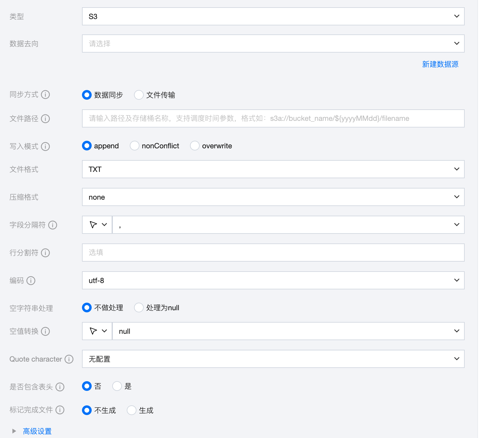 Quote character | 无配置:目标端写入数据时不进行引号添加操作,值与来源端一致。 双引号("):目标端写入数据时为每个值自动添加双引号",如"123"。 单引号('):标端写入数据时为每个值自动添加单引号',如'123'。 |