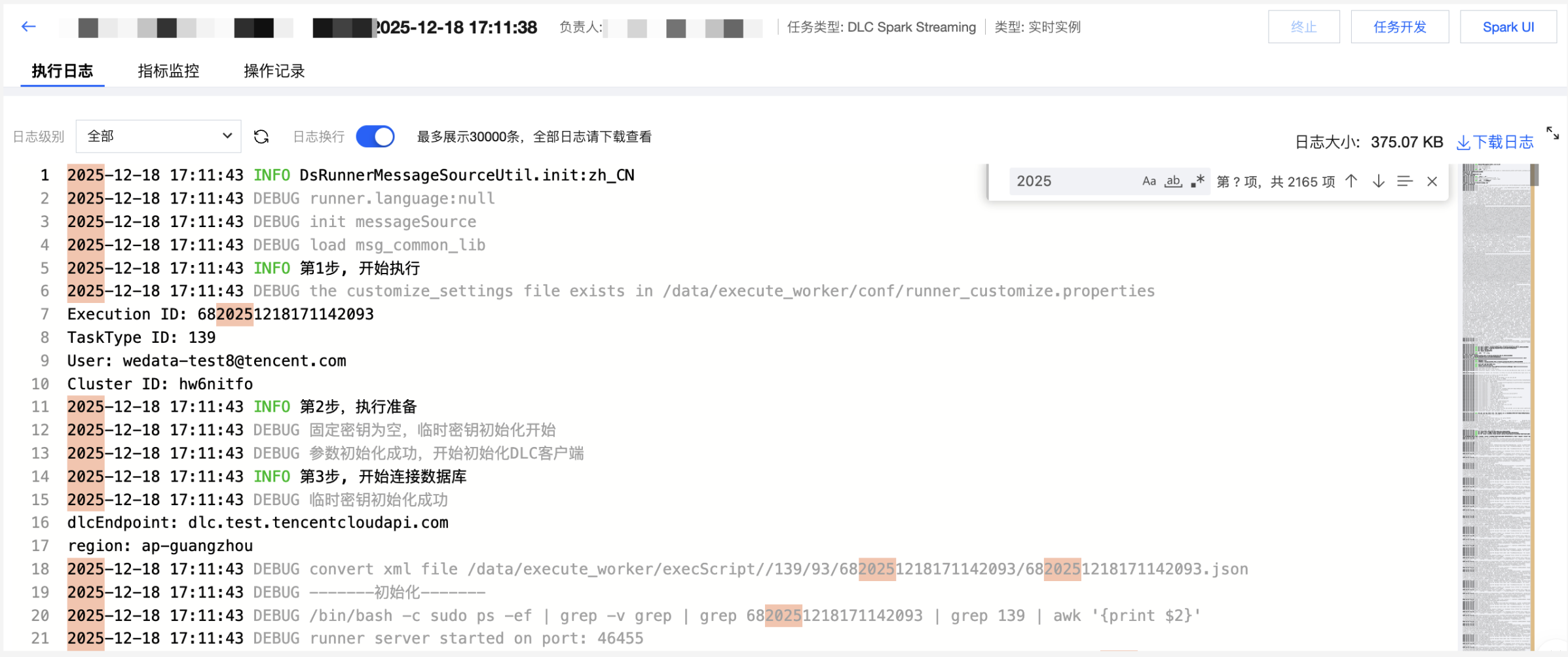 执行日志 | 查看实时实例运行日志,日志支持按不同日志级别筛选、支持刷新和日志换行、日志下载、日志关键字搜索。 日志最多展示从开始执行起的30000条,全部日志下载可查看。 点击SparkUI按钮可跳转到SparkUI链接查看引擎运行指标。 ![]() |